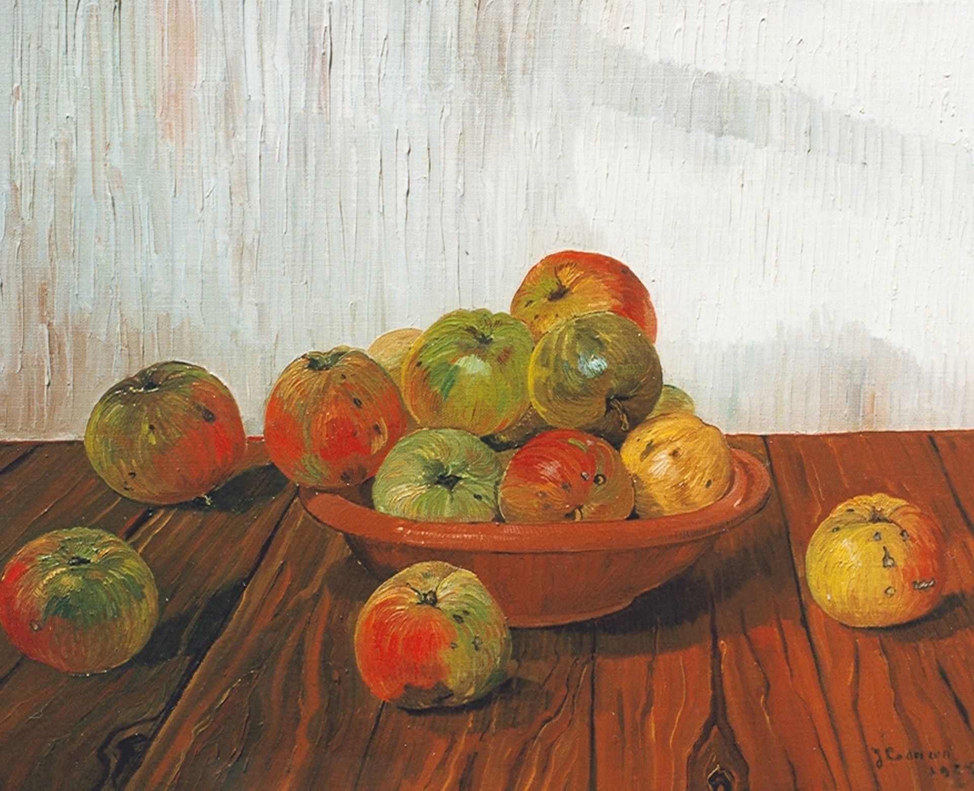 Jo Lodeizen kunstwerk • schilderij • voorheen te koop Stilleven met appels op een eiken tafel