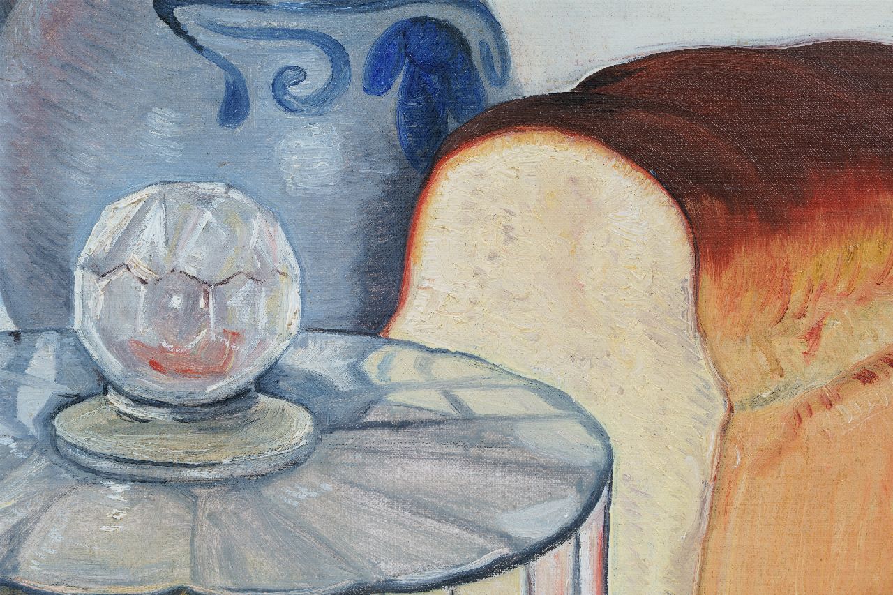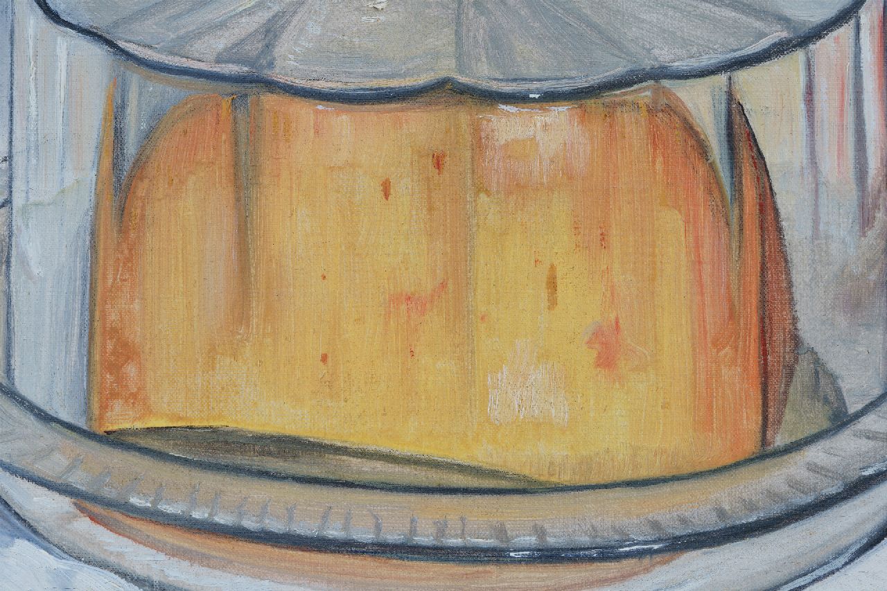 Jo Lodeizen kunstwerk • schilderij • voorheen te koop Stilleven met kan, witbrood en kaas onder stolp
