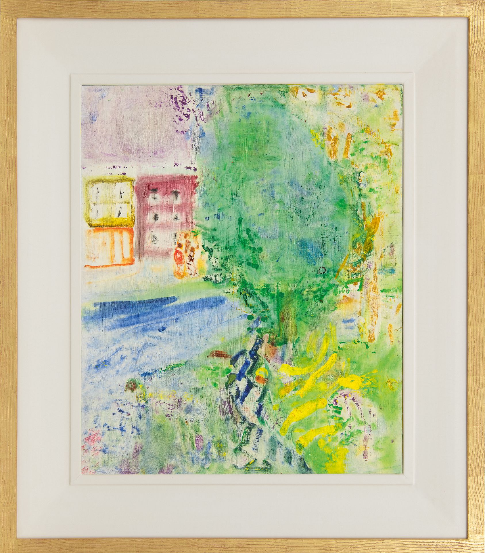 Job Hansen kunstwerk • schilderij • voorheen te koop huizen, kinderen; boom en water