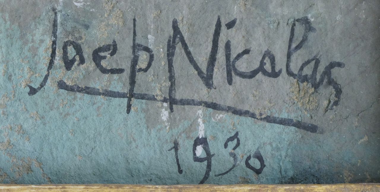 De Limburger Joep Nicolas is vooral bekend geworden als glazenier, een vak dat zijn vader en grootvader ook al beoefenden. De vrije schilderkunst speelde altijd een rol in zijn leven, maar werd vooral belangrijk vanaf de jaren 30, toen hij in het Noord-Hollandse Groet ging wonen. Zijn schilderijen componeerde hij naar eigen zeggen als een musicus. 'Ik werk met kleurtonen, met lijnen als melodieën gebroken door contrapunten'. In 1939 vertrok hij naar de Verenigde Staten waar hij tal van opdrachten voor glas-in-loodramen kreeg. Hij werd naar Nederland teruggeroepen om in de Oude Kerk in Delft 25 glasramen te maken, die worden beschouwd als zijn magnum opus. Nicolas was een erudiet man, een schepper, denker en levensgenieter.