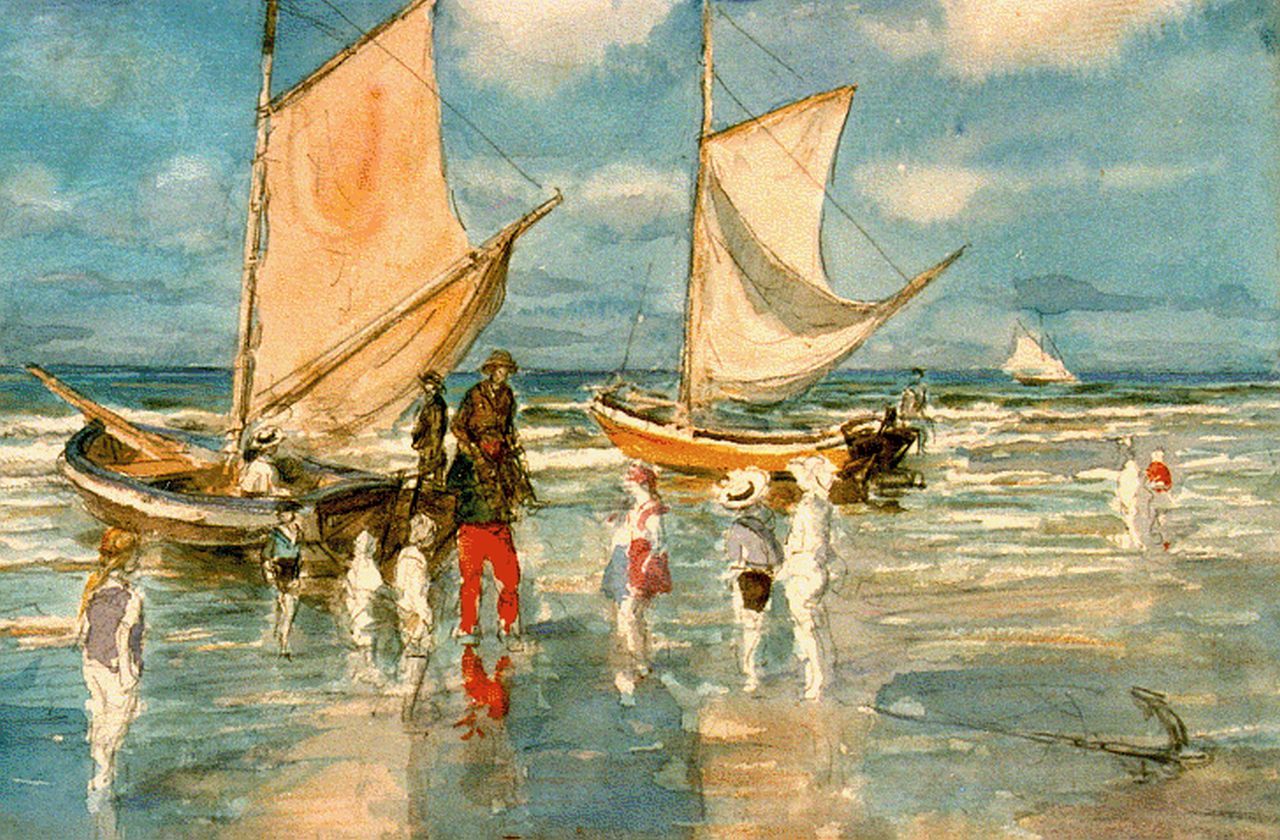 Johan Antoni de Jonge kunstwerk • aquarel • tekening • voorheen te koop Terugkomst van een zeiltochtje