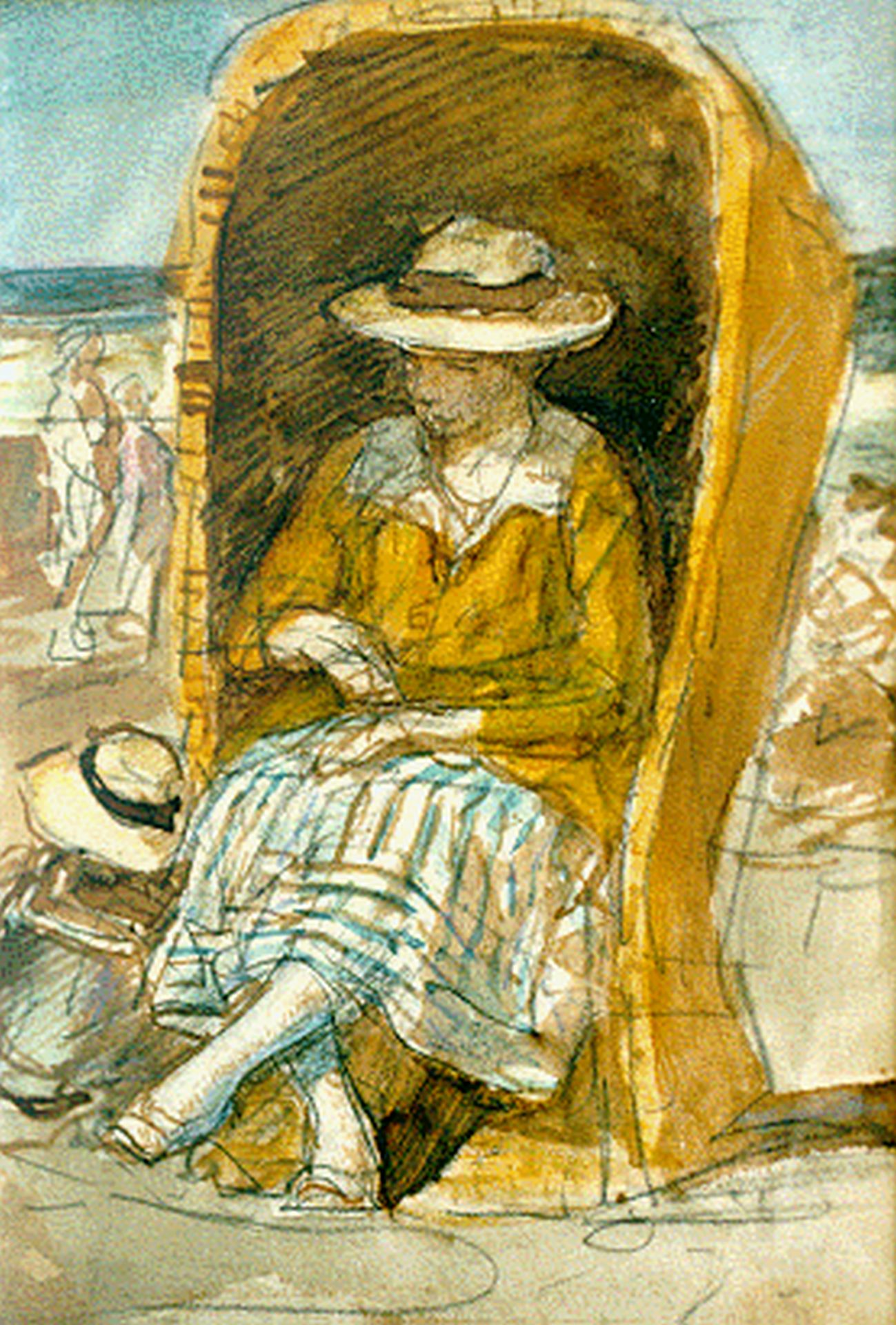 Johan Antoni de Jonge kunstwerk • aquarel • tekening • voorheen te koop Vrouw in strandstoel op 't strand