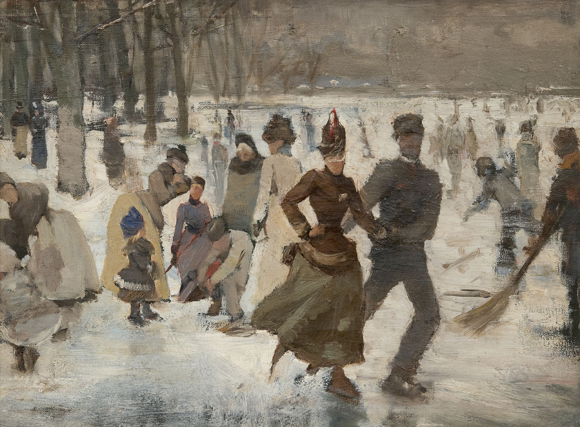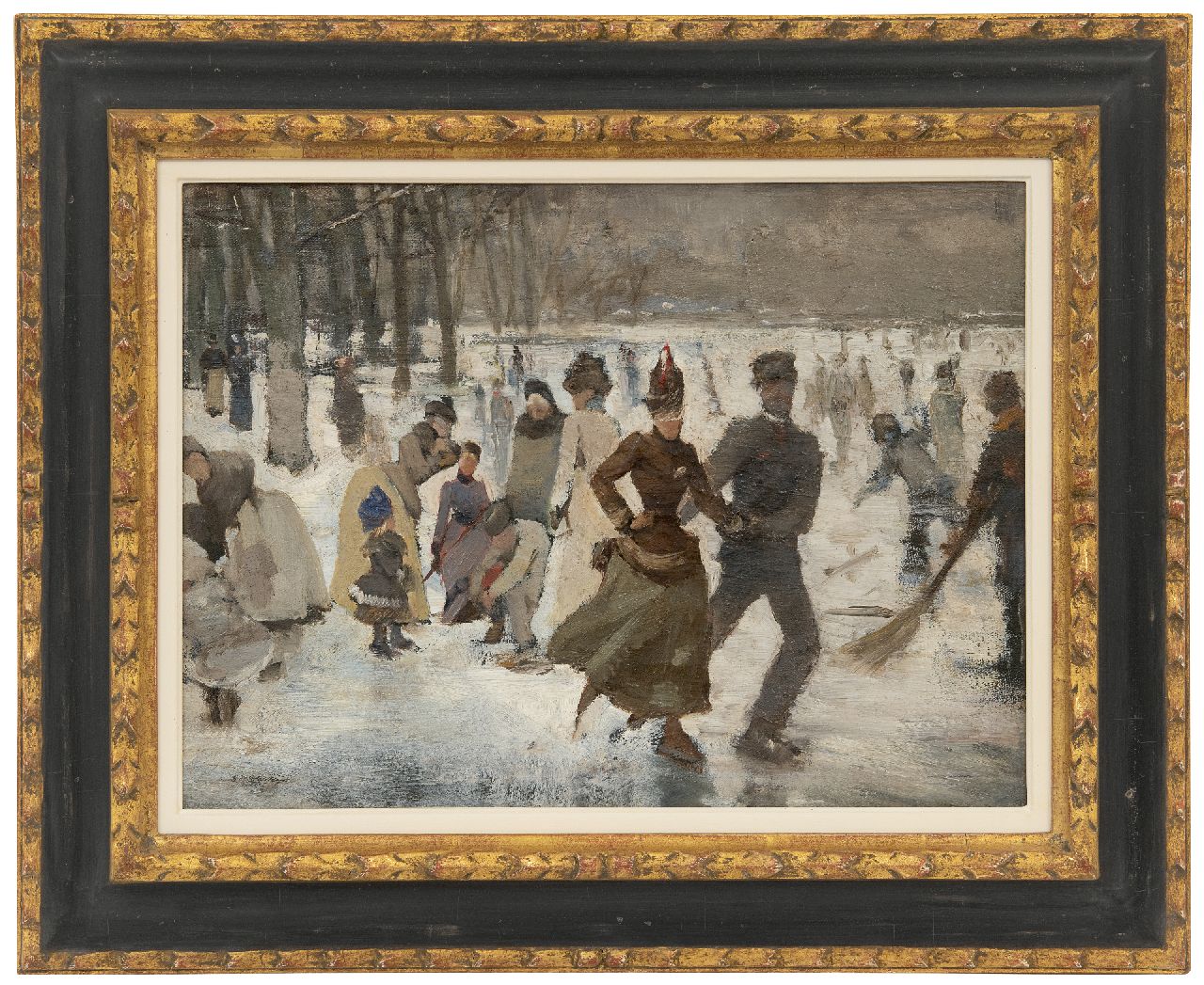 Johan Antoni de Jonge kunstwerk • schilderij • te koop Schaatsvertier op een bosvijver