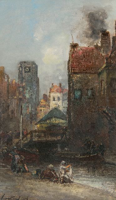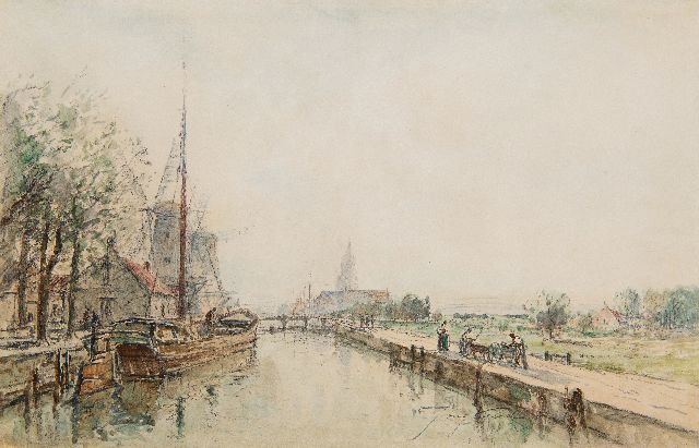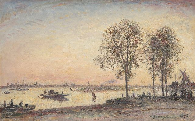 Een groot deel van zijn leven bracht Jongkind door in Frankrijk. Regelmatig reisde hij naar Nederland waar hij, vooral in en om Rotterdam, inspiratie opdeed voor zijn stads- en havengezichten en landschappen met schepen. Uniek waren zijn landschappen bij maanlicht. Zijn losse, vrije penseelstreek verlenen zijn schilderijen de directheid van het werk van de impressionisten. Toch schilderde hij ze allemaal in zijn atelier. Franse tijdgenoten bewonderden zijn werk en algemeen zagen ze hem als de wegbereider van het impressionisme. Manet noemde hem de vader van de moderne landschapschilders. In 1855 reisde Jongkind vanuit Parijs naar Nederland. Na enige omzwervingen belandde hij in Rotterdam, waar hij vijf jaar zou blijven wonen. Hij nam zijn intrek in het oosten van de stad, op 's Rijkswerf, de tegenwoordige Admiraliteitskade, dicht bij de boten en het water, die een grote aantrekkingskracht op hem uitoefenden. In 1866 en in de drie daarop- volgende jaren keerde hij herhaaldelijk terug naar Rotterdam, hetgeen resulteerde in vele schetsen, tekeningen en aquarellen. Zo ontstond in 1868 dit meesterlijk getroffen havengezicht in Rotterdam. Het zou de Wijnhaven of de Scheepmakershaven kunnen voorstellen, met het silhouet van de Zuiderkerk op de achtergrond. Het schilderen met waterverf had hij geleerd van Schelfhout, die de techniek voornamelijk toepaste op voorstudies. Jongkind maakte er een zelfstandig genre van. Het vlugge medium leende zich in feite beter voor het vastleggen van indrukken dan de trage olie. De blauwe lucht is in een brede beweging van een nat penseel neergezet. Enkele eenvoudige penseelstreken waren voldoende voor de weerspiegeling van het licht en de schepen in het kalm rimpelende water.