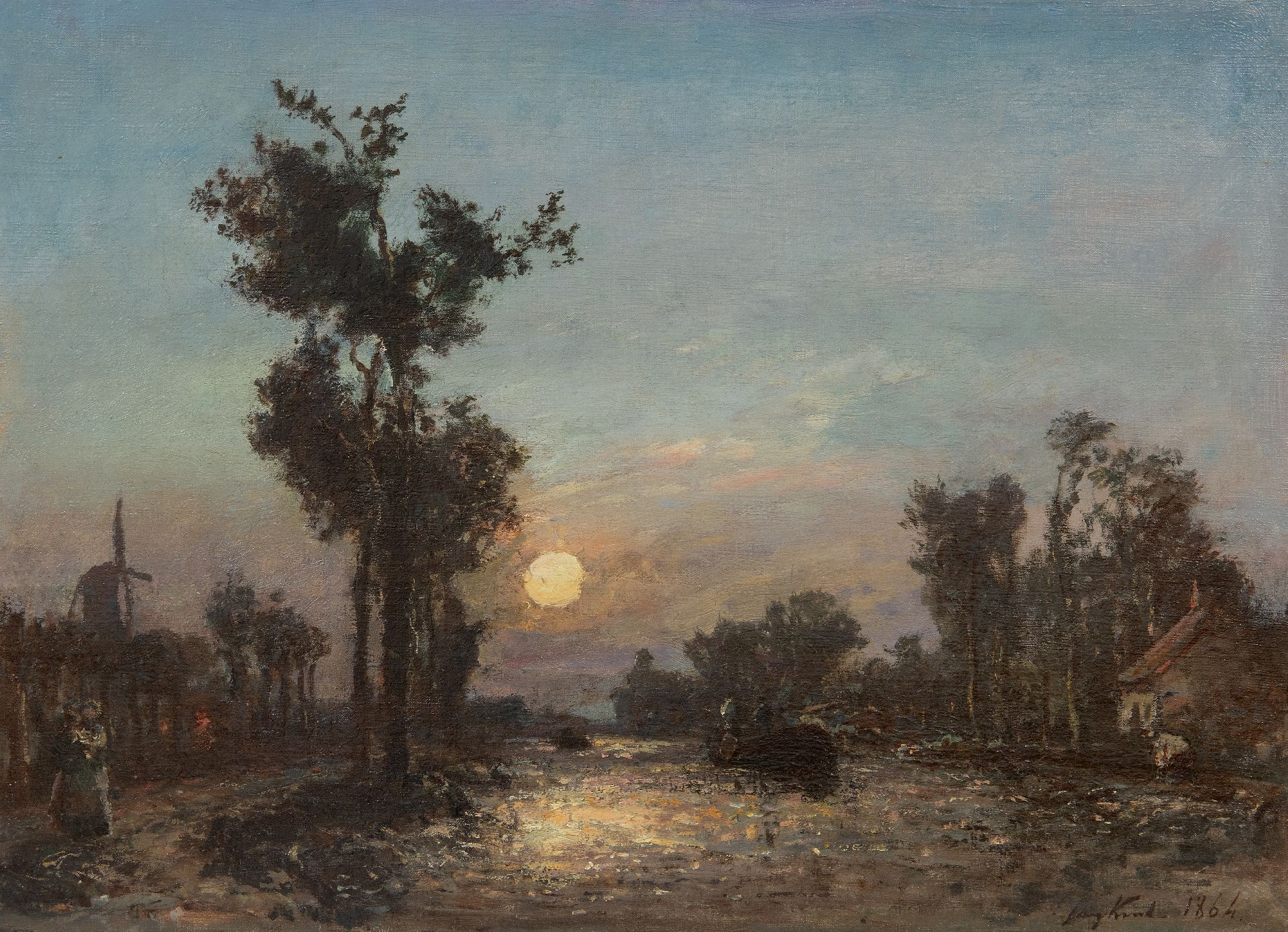 Een groot deel van zijn leven bracht Jongkind door in Frankrijk. Regelmatig reisde hij naar Nederland waar hij, vooral in en om Rotterdam, inspiratie opdeed voor zijn stads- en havengezichten en landschappen met schepen. Uniek waren zijn landschappen bij maanlicht. Zijn losse, vrije penseelstreek verleent zijn schilderijen de directheid van het werk van de impressionisten. Toch schilderde hij ze allemaal in het atelier. Franse tijdgenoten bewonderden zijn werk en algemeen zagen ze hem als de wegbereider van het impressionisme. Manet noemde hem de vader van de moderne landschapschilders. In Jongkinds vroegste werk is invloed van zijn eerste leermeester Andreas Schelfhout duidelijk aanwezig. De Franse schrijver en criticus Emile Zola (1840-1902) schreef over Jongkind: 'Ik ken geen interessantere persoonlijkheid. […] Zijn vak als schilder is net zo bijzonder als zijn manier van kijken […] Je zou zeggen dat het ruwe schetsen zijn die haastig zijn getekend, uit angst dat de eerste impressie ontsnapt. Je voelt dat het fenomeen zich afspeelt in het oog en de hand van de kunstenaar. Hij ziet een landschap in één oogopslag, in de werkelijkheid van het geheel, en vertaalt dat op zijn manier. Terwijl hij de waarheid ervan bewaart en daaraan de emotie doorgeeft die hij voelde. En dát maakt dat het landschap leeft op het doek, niet meer zoals het leeft in de natuur, maar zoals het enkele uren heeft geleefd in een zeldzame en uitgelezen persoonlijkheid. […] Hier is alles origineel, het vak, de impressie en alles is waar, omdat het landschap is gevat in de werkelijkheid voordat het is geleefd door een man.' (Emile Zola, 'Mon Salon. Les Paysagistes' in: 'L'Événement illustré', 1 juni 1868).