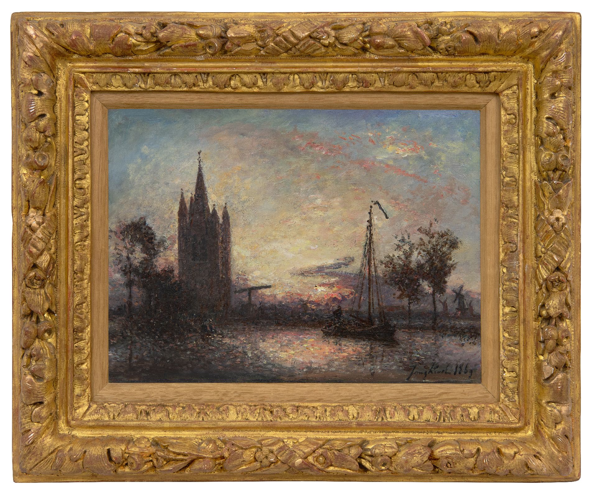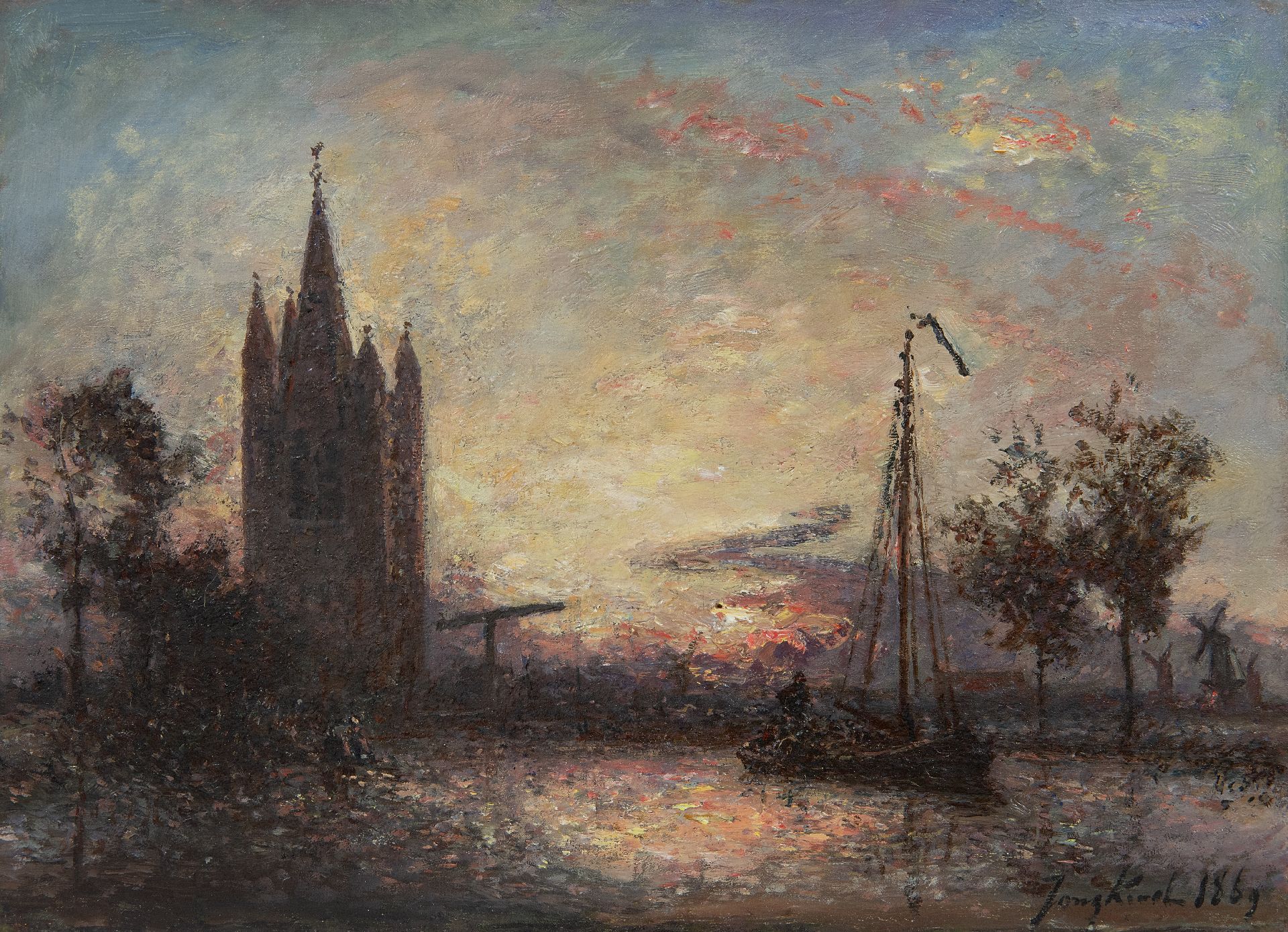 Een groot deel van zijn leven bracht Jongkind door in Frankrijk. Regelmatig reisde hij naar Nederland waar hij vooral in en om Rotterdam inspiratie opdeed voor zijn stads- en havengezichten en landschappen met schepen. Uniek waren zijn landschappen bij maanlicht. Zijn losse, vrije penseelstreek verleent zijn schilderijen de directheid van het werk van de impressionisten. Toch schilderde hij ze allemaal in het atelier. Franse tijdgenoten bewonderden zijn werk en algemeen zagen ze hem als de wegbereider van het impressionisme. Manet noemde hem de vader van de moderne landschapschilders. In dit Hollandse tafereel tekenen zich in het zilveren licht van een zonsondergang de de silhouetten van een platbodem en een ophaalbrug duidelijk af, evenals dat van een kerktoren, die geinspireerd lijkt te zijn op de oude Kerk van Delft.