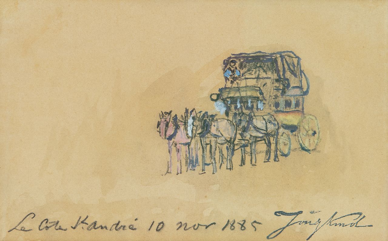 Een groot deel van zijn leven bracht Jongkind door in Frankrijk. Regelmatig reisde hij naar Nederland waar hij, vooral in en om Rotterdam, inspiratie opdeed voor zijn stads- en havengezichten en landschappen met schepen. Uniek waren zijn landschappen bij maanlicht. Zijn losse, vrije penseelstreek verleent zijn schilderijen de directheid van het werk van de impressionisten. Toch schilderde hij ze allemaal in het atelier. Franse tijdgenoten bewonderden zijn werk en algemeen zagen ze hem als de wegbereider van het impressionisme. Manet noemde hem de vader van de moderne landschapschilders. Jongkind maakte ook schitterende tekeningen en aquarellen. Het thema van de postkoets komt vanaf 1889 op meerdere schilderijen van Jongkind voor (zie A. Stein, 'Jongkind, Peintures I', cat. nrs. 875, 876, 886, 887). In 1878 kocht Jules, de zoon van mme. Fesser, een propriété in la Côte Saint-André met een atelier voor Jongkind en zijn moeder. Tussen 1879 en 1890 verdeelden Jongkind en Joséphine Fesser hun tijd tussen Parijs en la Côte-Saint-André. I