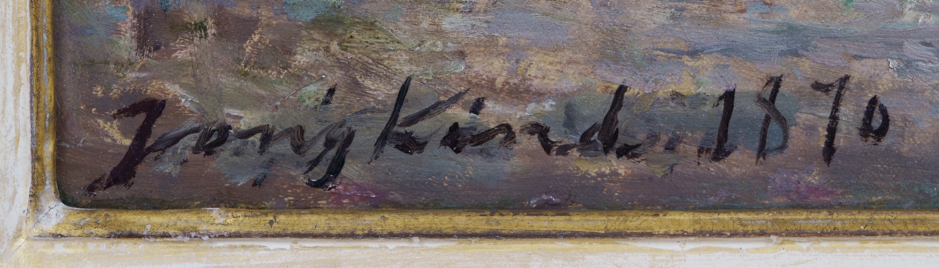 Een groot deel van zijn leven bracht Jongkind door in Frankrijk. Regelmatig reisde hij naar Nederland waar hij, vooral in en om Rotterdam, inspiratie opdeed voor zijn stads- en havengezichten en landschappen met schepen. Uniek waren zijn landschappen bij maanlicht. Zijn losse, vrije penseelstreek verleent zijn schilderijen de directheid van het werk van de impressionisten. Toch schilderde hij ze allemaal in het atelier. Franse tijdgenoten bewonderden zijn werk en algemeen zagen ze hem als de wegbereider van het impressionisme. Manet noemde hem de vader van de moderne landschapschilders. In Jongkinds vroegste werk is invloed van zijn eerste leermeester Andreas Schelfhout duidelijk aanwezig. De Franse schrijver en criticus Emile Zola (1840-1902) schreef over Jongkind: 'Ik ken geen interessantere persoonlijkheid. […] Zijn vak als schilder is net zo bijzonder als zijn manier van kijken […] Je zou zeggen dat het ruwe schetsen zijn die haastig zijn getekend, uit angst dat de eerste impressie ontsnapt. Je voelt dat het fenomeen zich afspeelt in het oog en de hand van de kunstenaar. Hij ziet een landschap in één oogopslag, in de werkelijkheid van het geheel, en vertaalt dat op zijn manier. Terwijl hij de waarheid ervan bewaart en daaraan de emotie doorgeeft die hij voelde. En dát maakt dat het landschap leeft op het doek, niet meer zoals het leeft in de natuur, maar zoals het enkele uren heeft geleefd in een zeldzame en uitgelezen persoonlijkheid. […] Hier is alles origineel, het vak, de impressie en alles is waar, omdat het landschap is gevat in de werkelijkheid voordat het is geleefd door een man.' (Emile Zola, 'Mon Salon. Les Paysagistes' in: 'L'Événement illustré', 1 juni 1868).