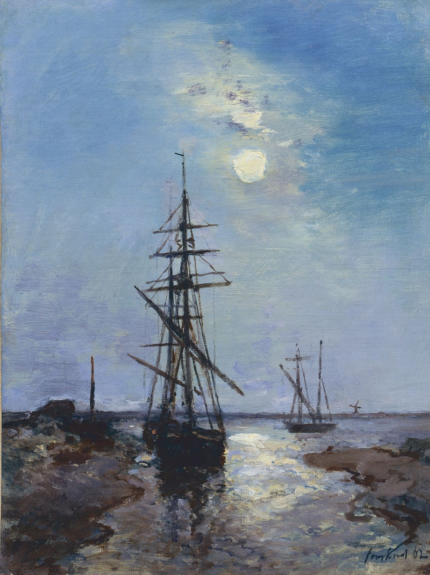 Een groot deel van zijn leven bracht Jongkind door in Frankrijk. Regelmatig reisde hij naar Nederland waar hij, vooral in en om Rotterdam, inspiratie opdeed voor zijn stads- en havengezichten en landschappen met schepen. Uniek waren zijn landschappen bij maanlicht. Zijn losse, vrije penseelstreek verleent zijn schilderijen de directheid van het werk van de impressionisten. Toch schilderde hij ze allemaal in het atelier. Franse tijdgenoten bewonderden zijn werk en algemeen zagen ze hem als de wegbereider van het impressionisme. Manet noemde hem de vader van de moderne landschapschilders. In Jongkinds vroegste werk is invloed van zijn eerste leermeester Andreas Schelfhout duidelijk aanwezig. De Franse schrijver en criticus Emile Zola (1840-1902) schreef over Jongkind: 'Ik ken geen interessantere persoonlijkheid. […] Zijn vak als schilder is net zo bijzonder als zijn manier van kijken […] Je zou zeggen dat het ruwe schetsen zijn die haastig zijn getekend, uit angst dat de eerste impressie ontsnapt. Je voelt dat het fenomeen zich afspeelt in het oog en de hand van de kunstenaar. Hij ziet een landschap in één oogopslag, in de werkelijkheid van het geheel, en vertaalt dat op zijn manier. Terwijl hij de waarheid ervan bewaart en daaraan de emotie doorgeeft die hij voelde. En dát maakt dat het landschap leeft op het doek, niet meer zoals het leeft in de natuur, maar zoals het enkele uren heeft geleefd in een zeldzame en uitgelezen persoonlijkheid. […] Hier is alles origineel, het vak, de impressie en alles is waar, omdat het landschap is gevat in de werkelijkheid voordat het is geleefd door een man.' (Emile Zola, 'Mon Salon. Les Paysagistes' in: 'L'Événement illustré', 1 juni 1868).