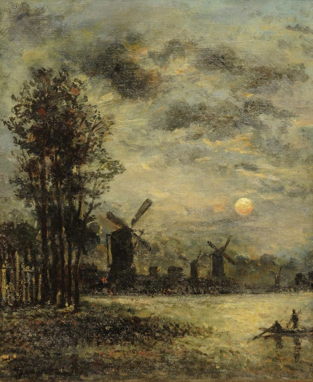 Johan Barthold Jongkind kunstwerk • schilderij • voorheen te koop Molens langs de rivier bij maanlicht