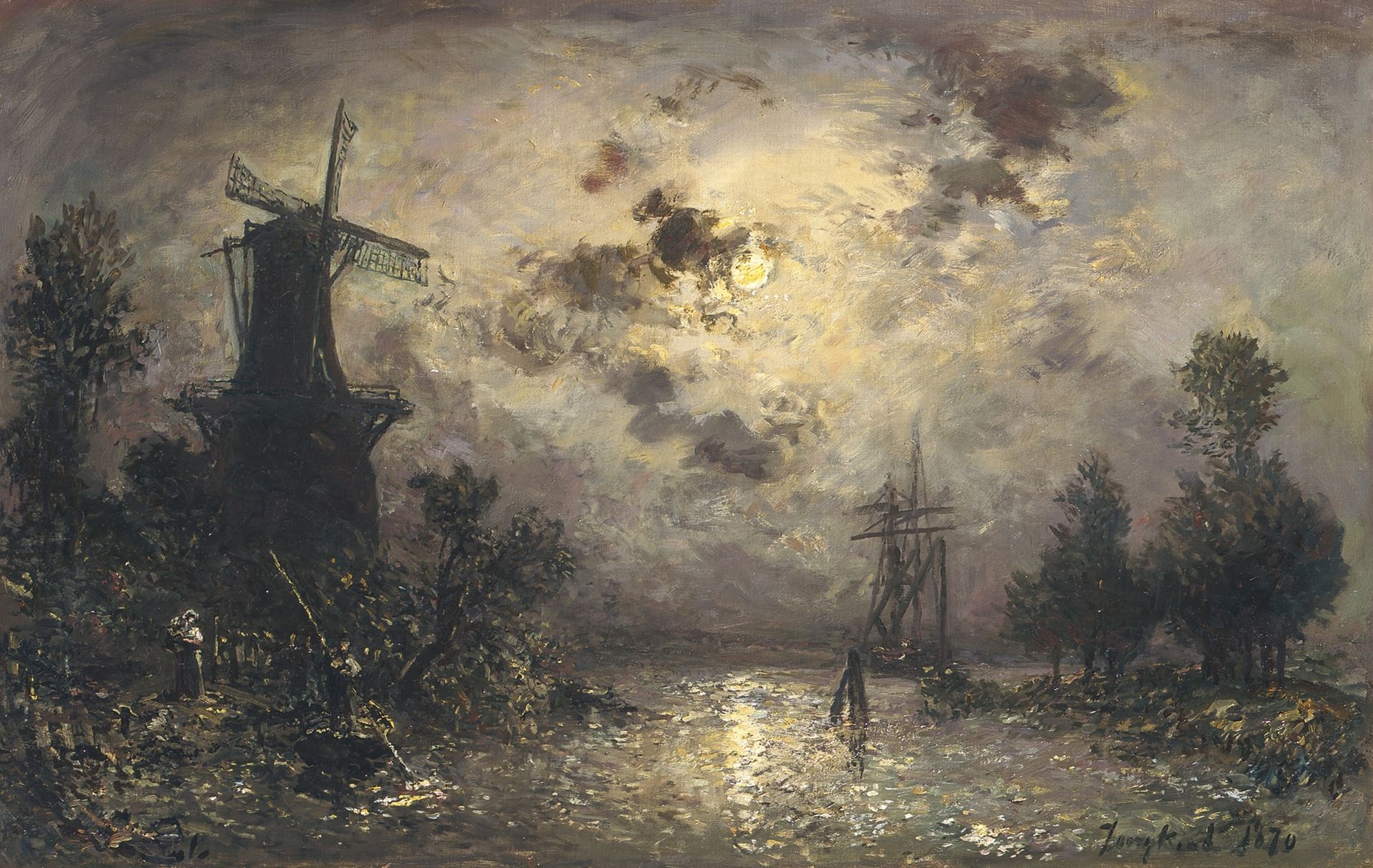 Johan Barthold Jongkind kunstwerk • schilderij • voorheen te koop Rivierlandschap bij maanlicht