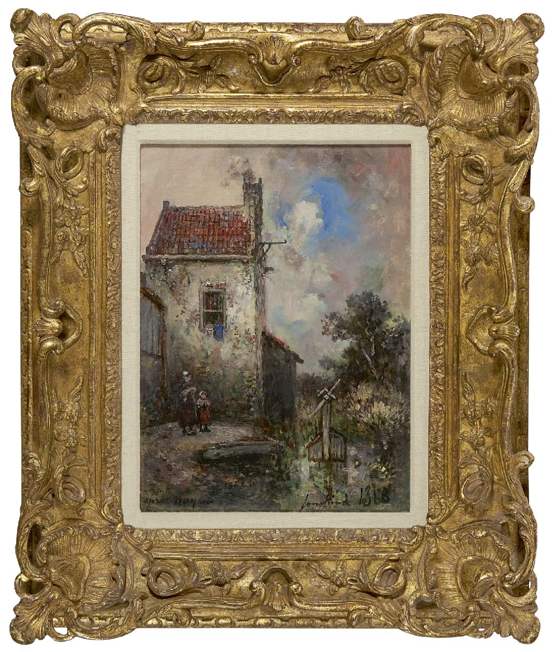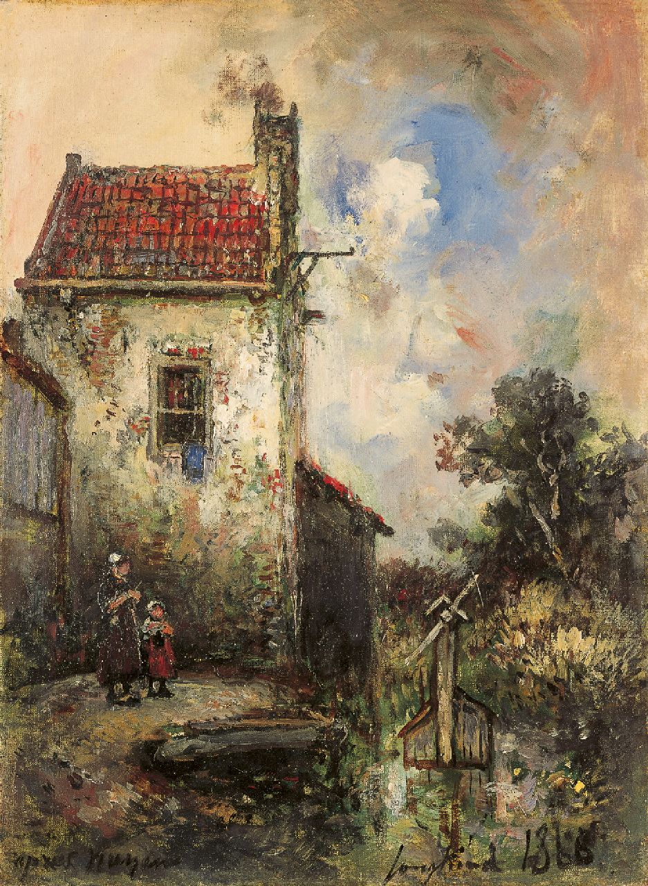 Johan Barthold Jongkind kunstwerk • schilderij • voorheen te koop Twee kinderen bij een huis