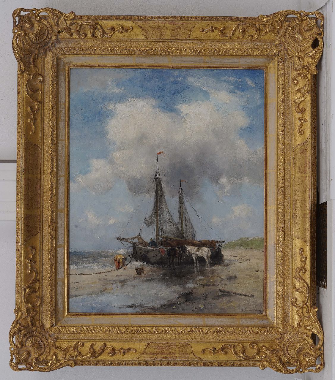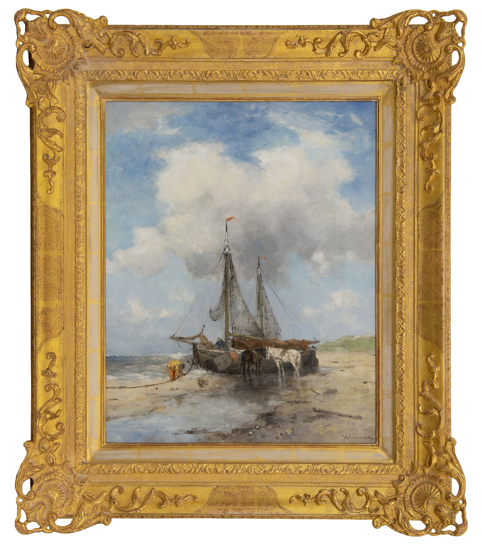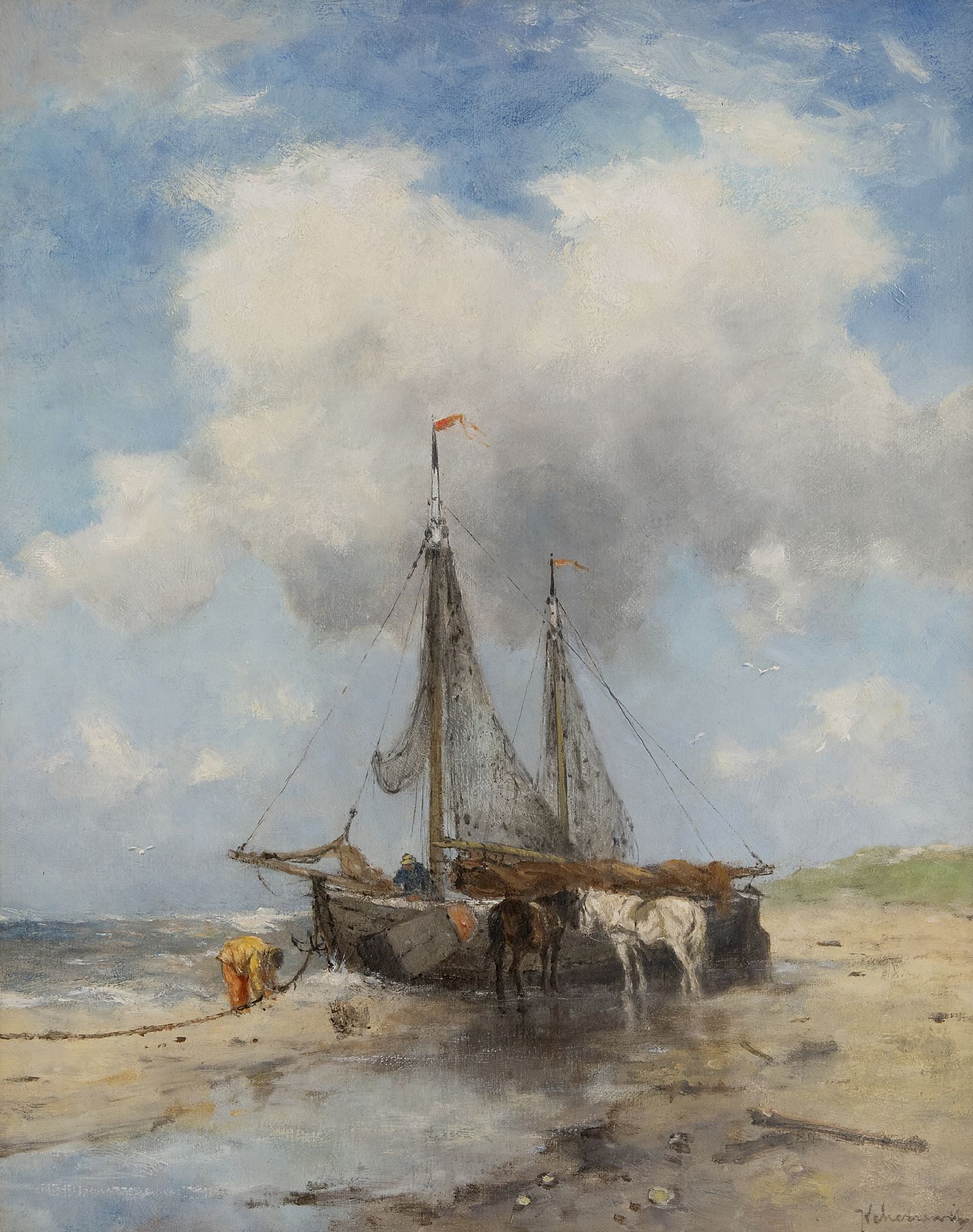 Johan Frederik Cornelis Scherrewitz kunstwerk • schilderij • te koop Bomschuiten op het strand