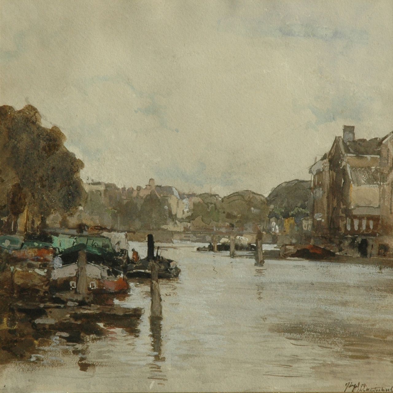 Johan Hendrik van Mastenbroek kunstwerk • aquarel • tekening • voorheen te koop Afgemeerde schepen in een binnenhaven