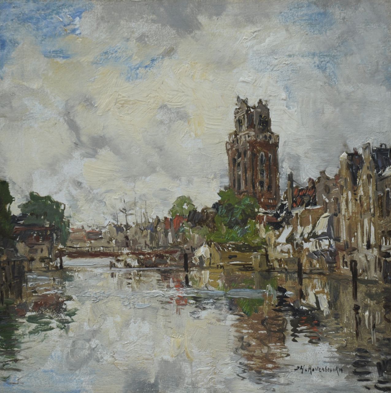 Johan Hendrik van Mastenbroek kunstwerk • schilderij • voorheen te koop Haven in Dordrecht met de toren van de Grote Kerk