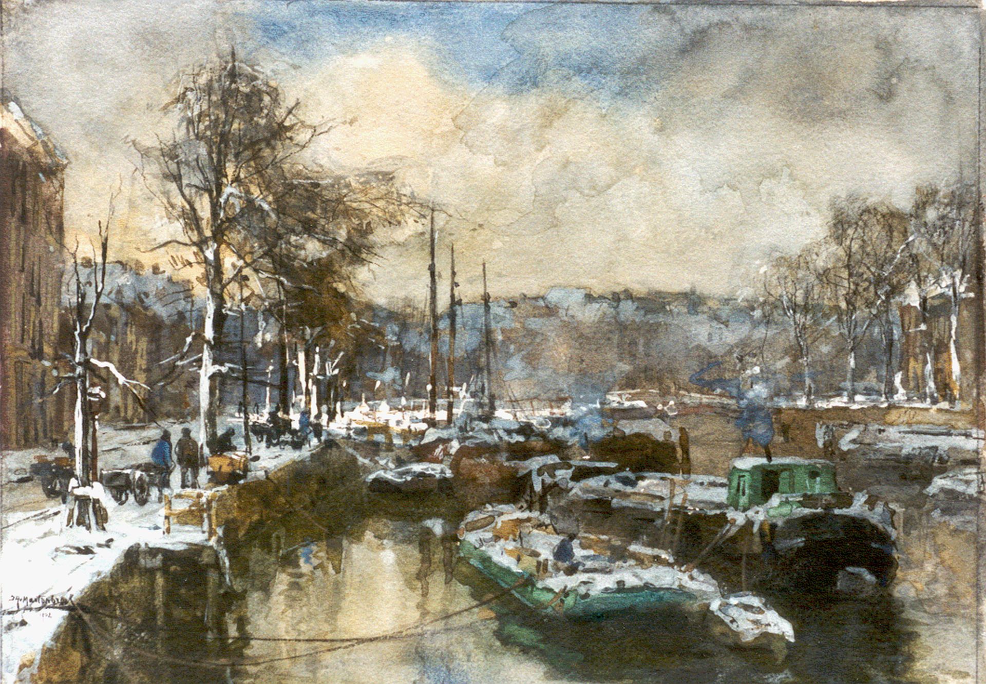 Johan Hendrik van Mastenbroek kunstwerk • aquarel • tekening • voorheen te koop Havengezicht te Rotterdam in de winter