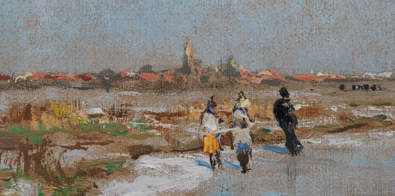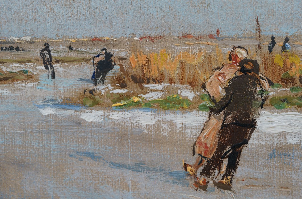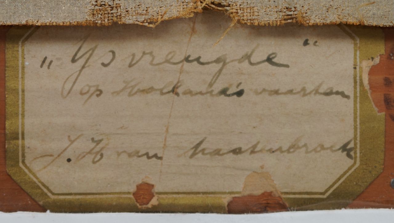 'IJsvreugde op Holland's vaarten' zoals de schilder het werk noemt op het etiket aan achterzijde betreft een prachtig voorbeeld een andere kwaliteit van Van Mastenbroek. Er zijn van de schilder slechts twee van dergelijke winters met schaatsers en koek-en-zopie bekend. Johan Hendrik van Mastenbroek is bekend geworden als schilder van de Rotterdamse havens, de Maas en de Zuiderzeewerken. Zijn werk documenteert als het ware de grote technische vooruitgang en de snel toenemende bedrijvigheid in de Rotterdamse havens na 1900. De schilder schetste graag buiten bij regenachtig weer om de schoonheid van de luchten en de heldere kleuren: 'Ik kon staan smullen van de heerlijke wolkenformaties en van den aan kleuren zo rijken strijd tusschen zon en wolken' schreef hij aan een vriend in 1945. Mastenbroek oogstte bij zijn leven al in brede kring veel succes met zijn werk.
