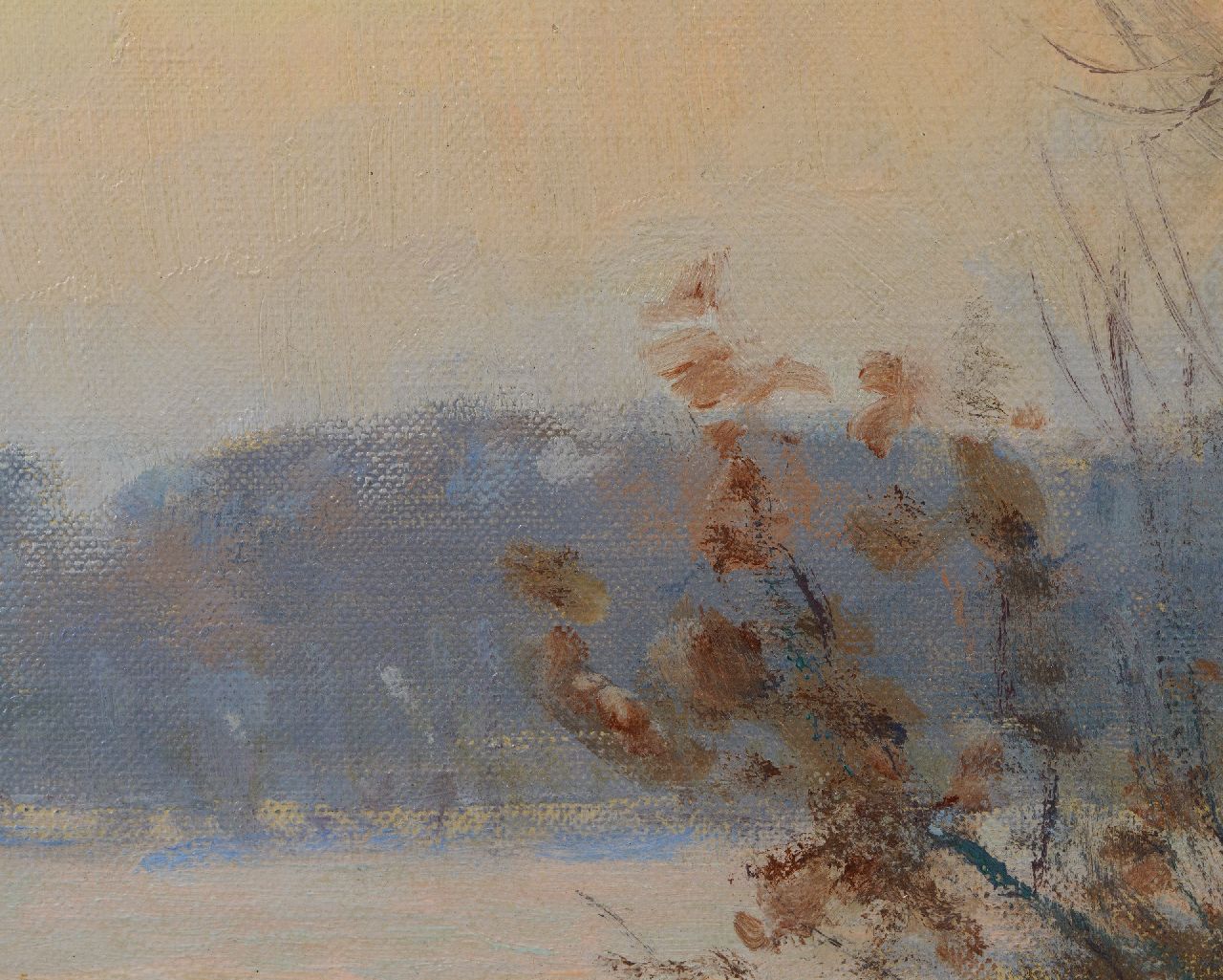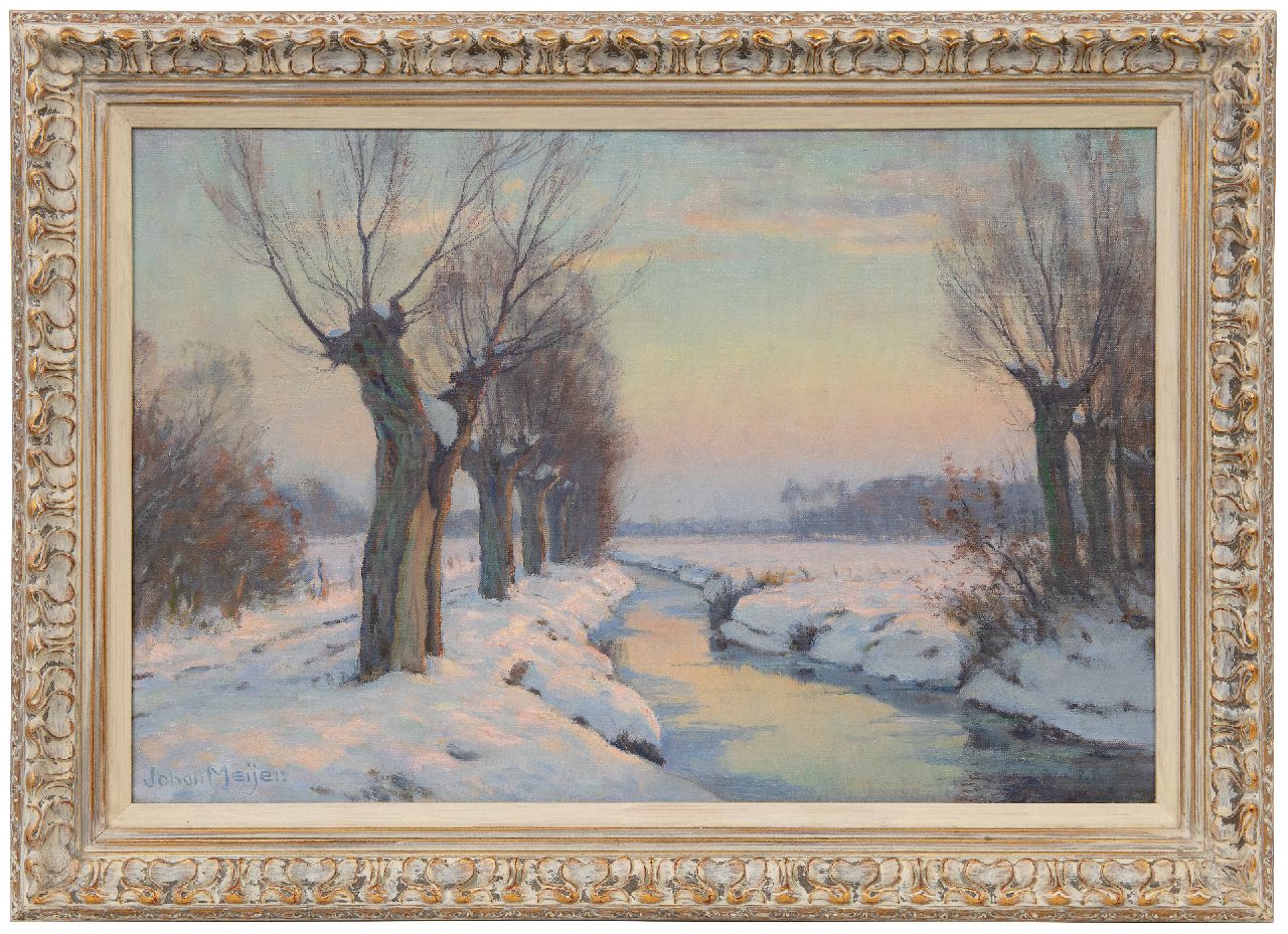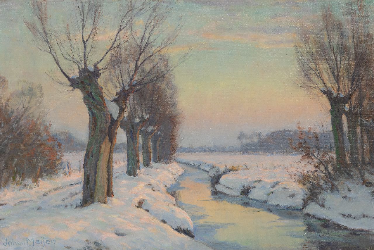 Johan Meijer kunstwerk • schilderij • voorheen te koop Sneeuwlandschap bij zonsopgang