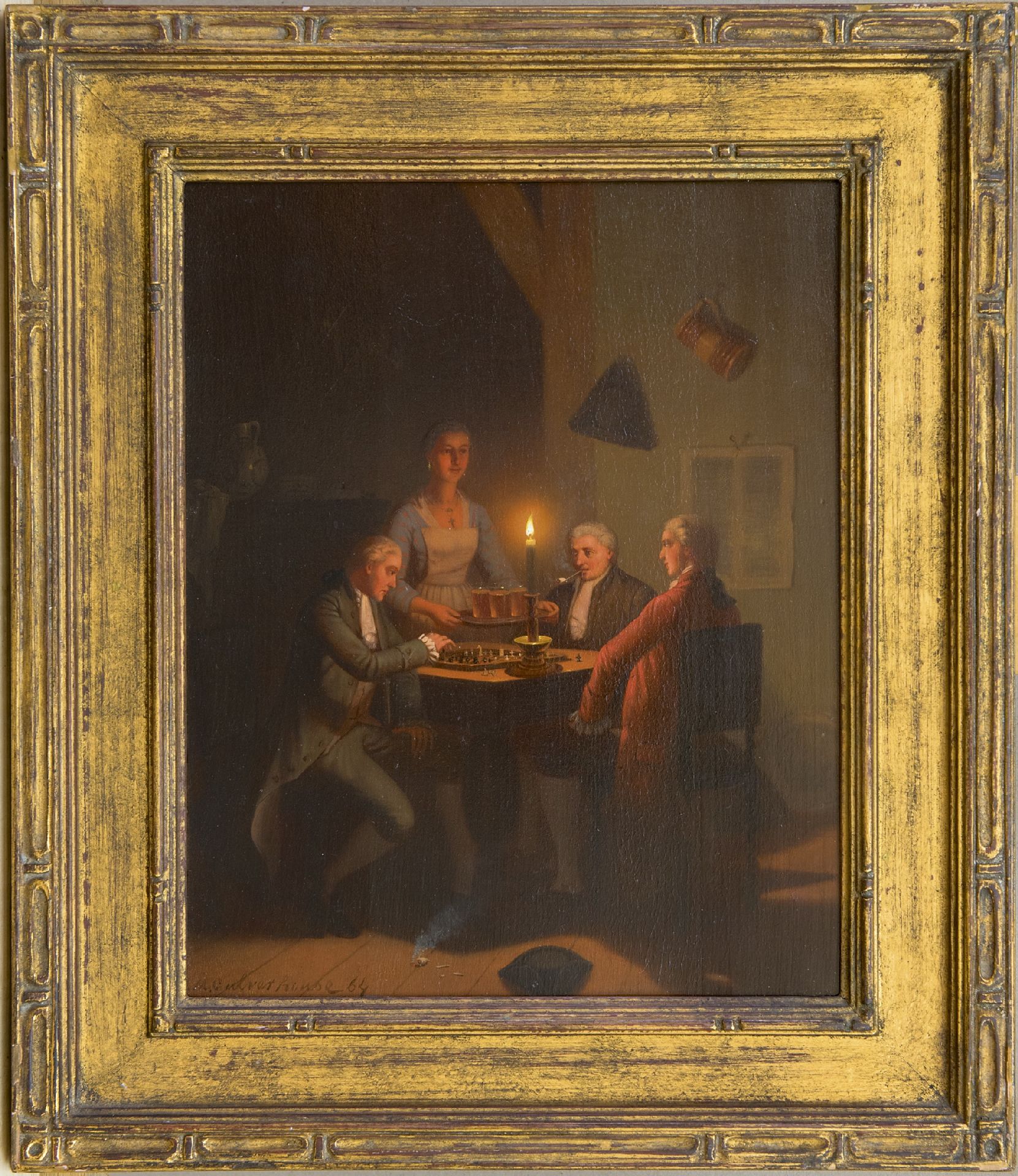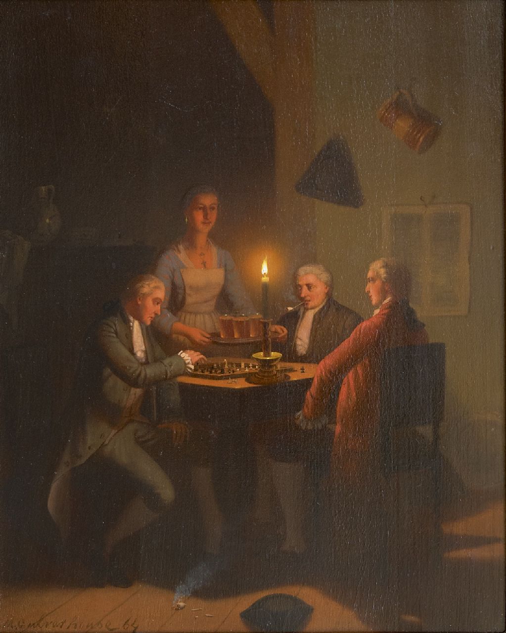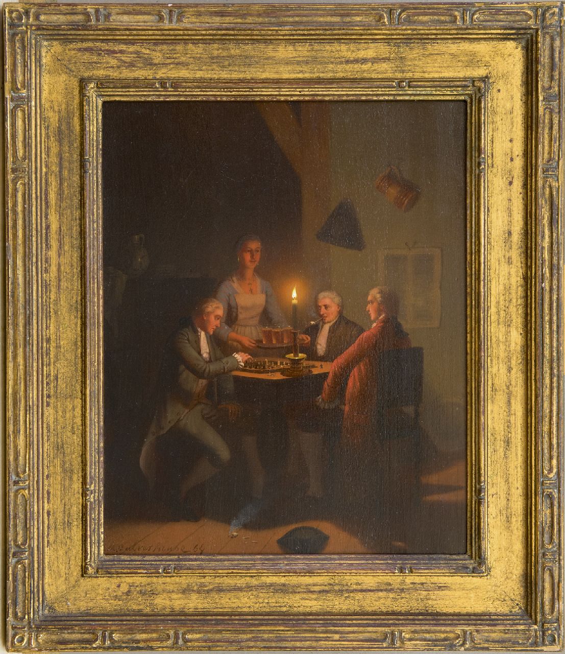 Johan Mengels Culverhouse kunstwerk • schilderij • te koop Drie bier voor de schaakspelers bij kaarslicht