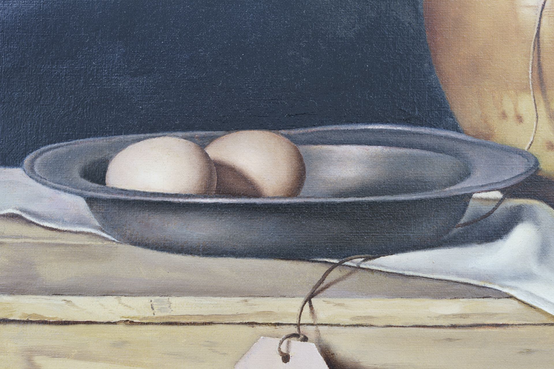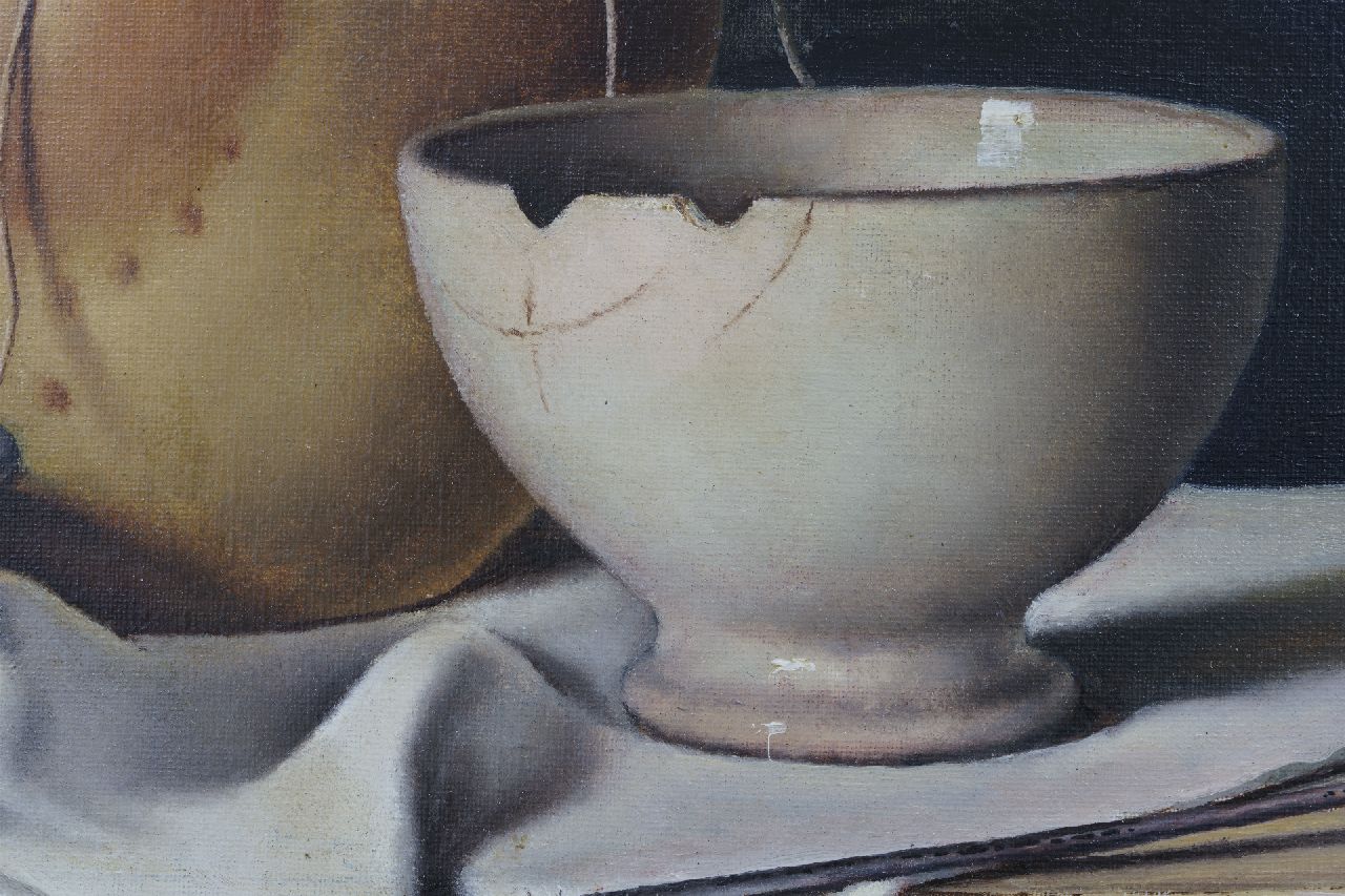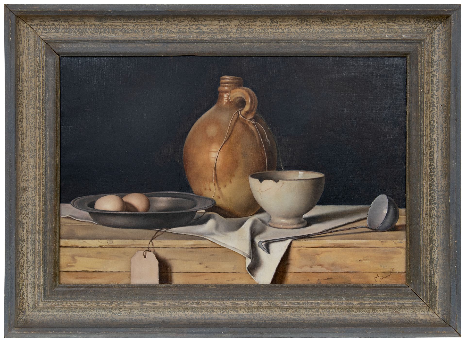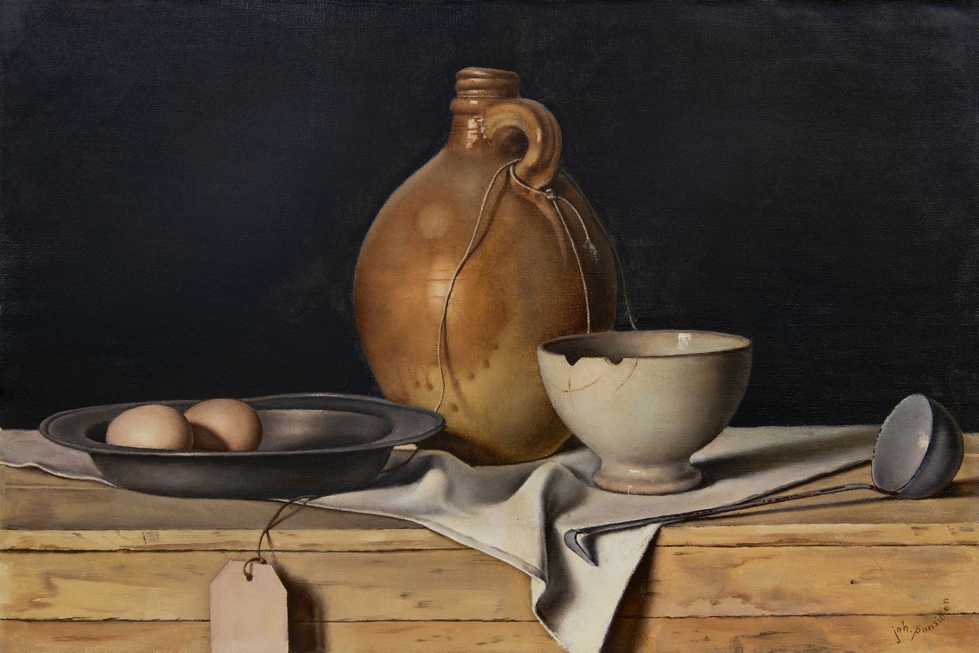 Johan Ponsioen kunstwerk • schilderij • voorheen te koop Stilleven met eieren, witte kom en aardewerken kruik