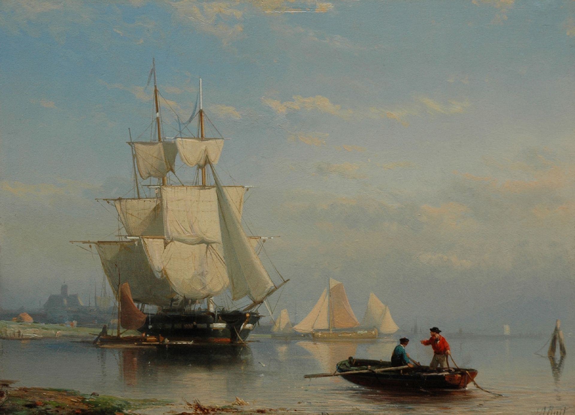 Johan Rust kunstwerk • schilderij • voorheen te koop Oorlogsfregat, voor anker de zeilen drogend