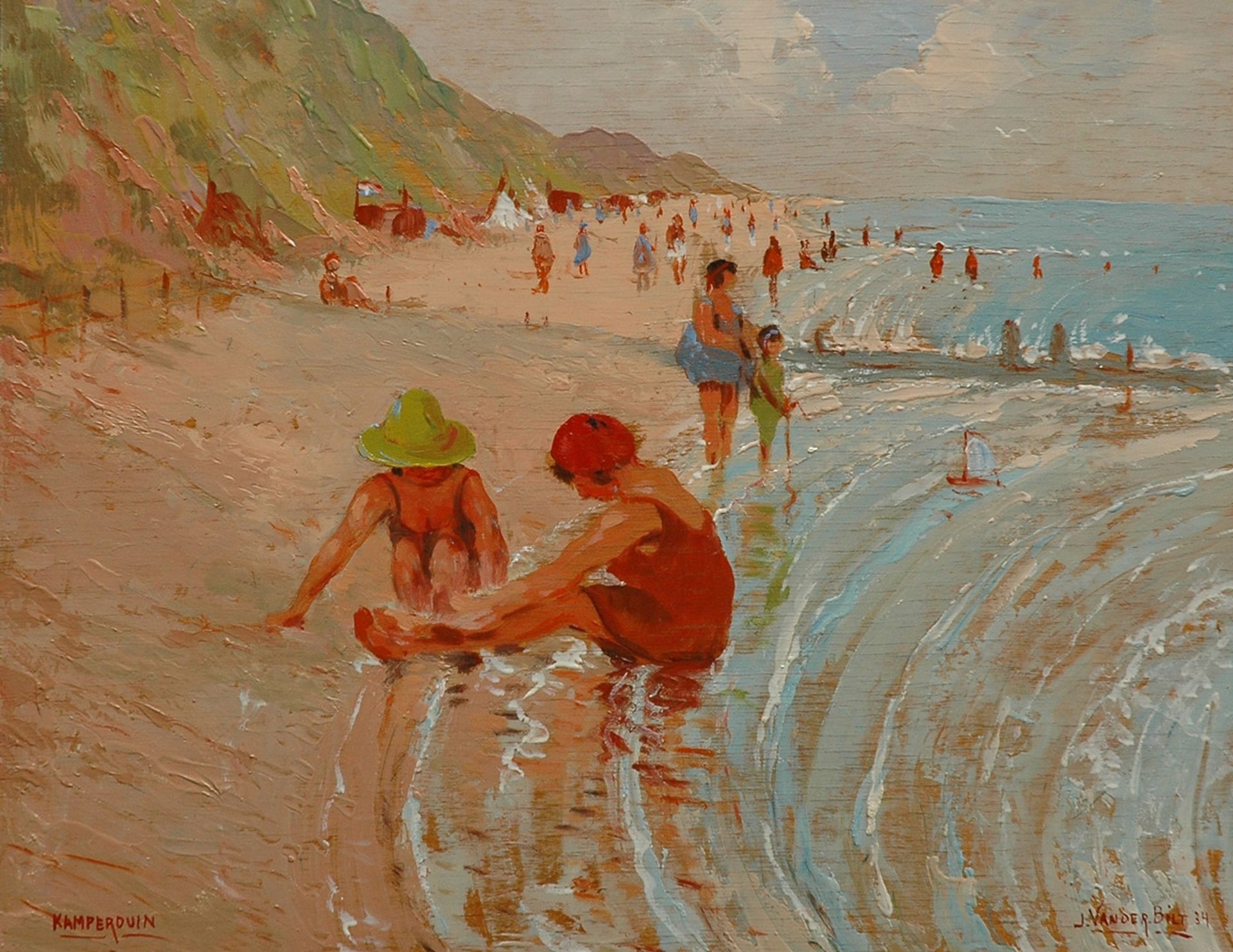 Johan van der Bilt kunstwerk • schilderij • voorheen te koop Spelende kinderen op het strand van Kamperduin