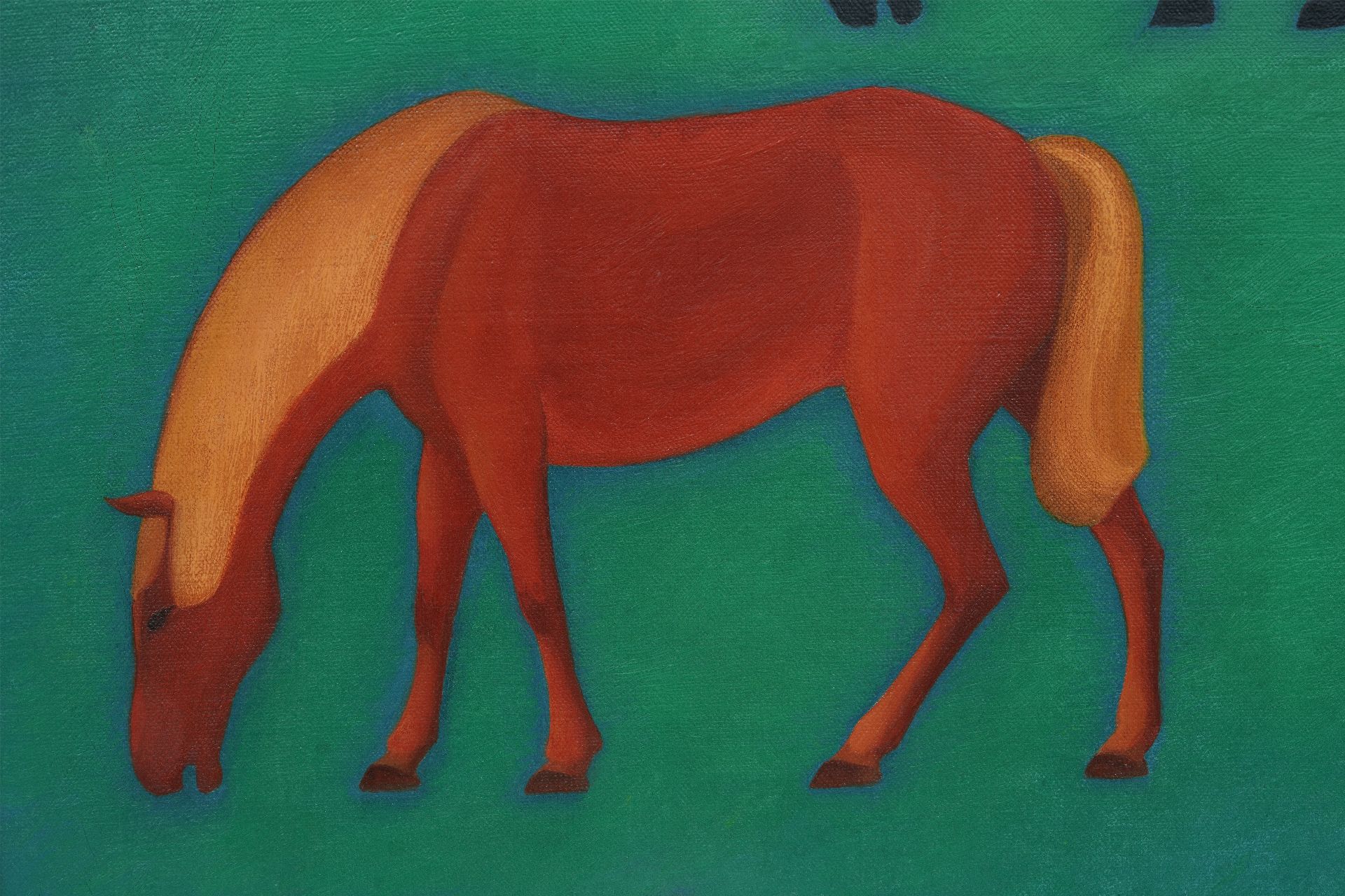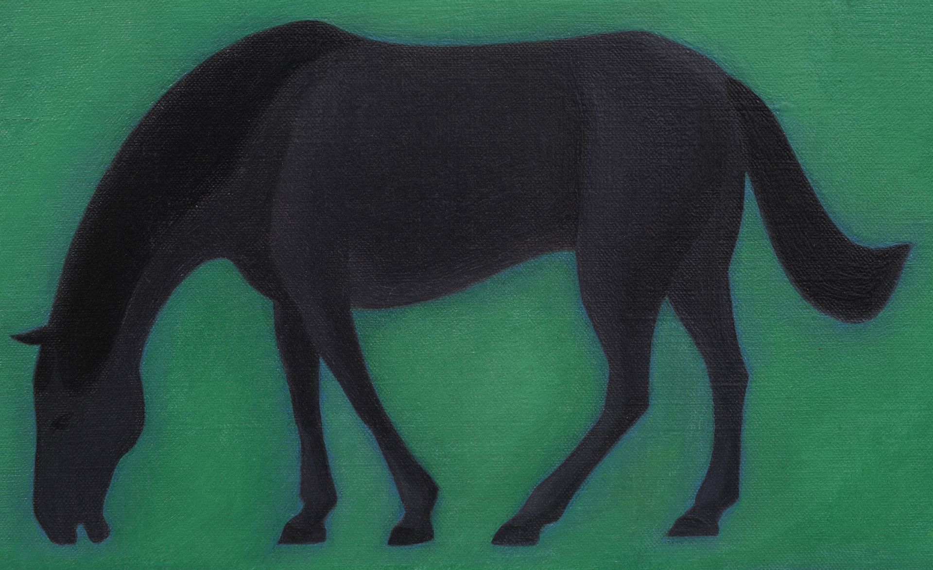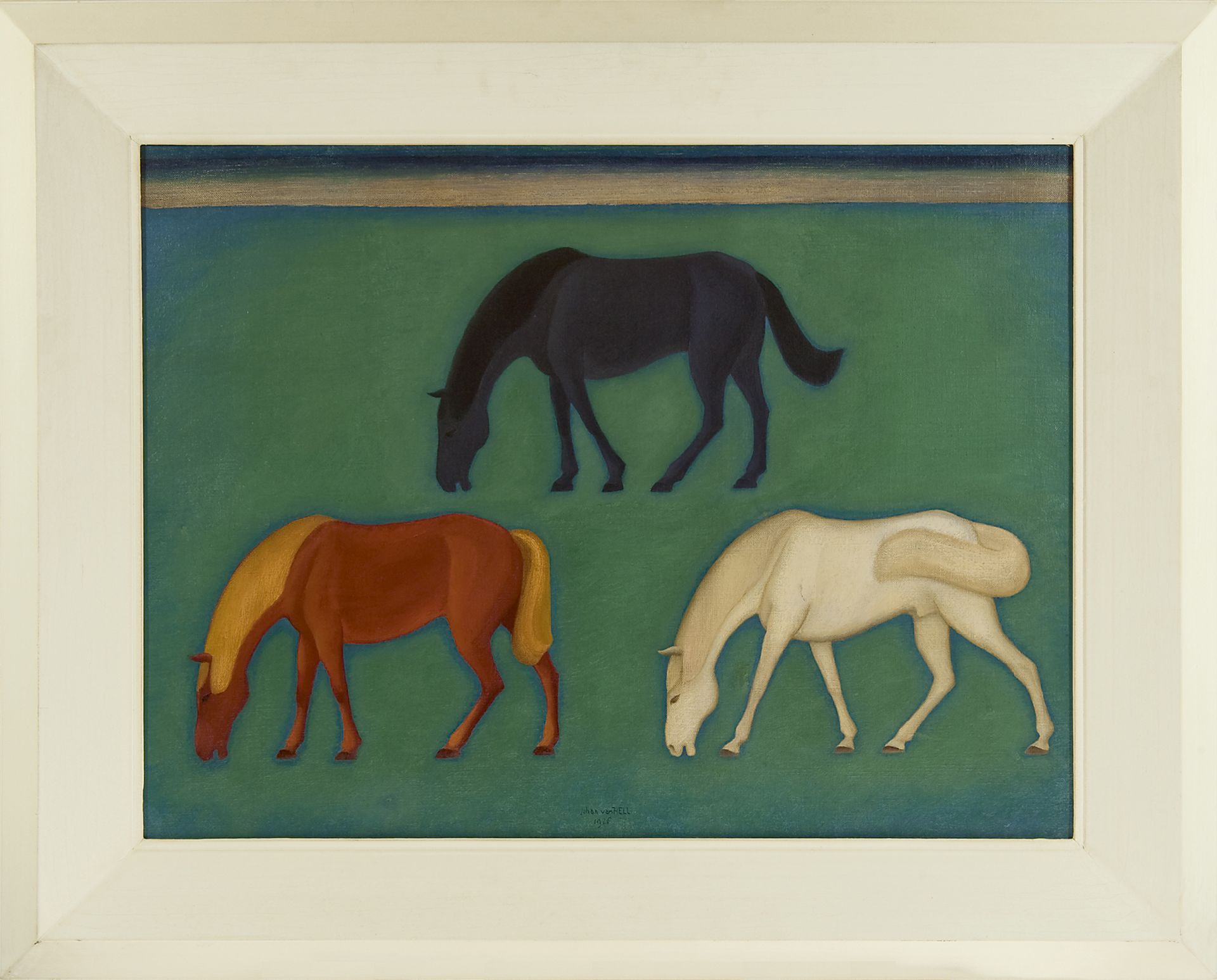 Paarden zijn multifunctioneel. Worden ze tegenwoordig vooral gehouden voor hobby en sport, vroeger waren ze onmisbare krachten op het land voor grondbewerking en oogst. De schilder-musicus Johan van Hell deed in de 20e eeuw wat anders dan zijn romantische collega's in de 19e eeuw. Als een sjabloon zijn de paarden uitgeknipt, gedupliceerd en in een driehoek geplaatst, waarmee hij elke ruimte-illusie wegneemt. De horizon is gereduceerd tot een smal lint. Van Hell was socialist. Hij wilde zijn onderwerpen zodanig vereenvoudigen dat elke arbeider en ongeletterde ze kon begrijpen.