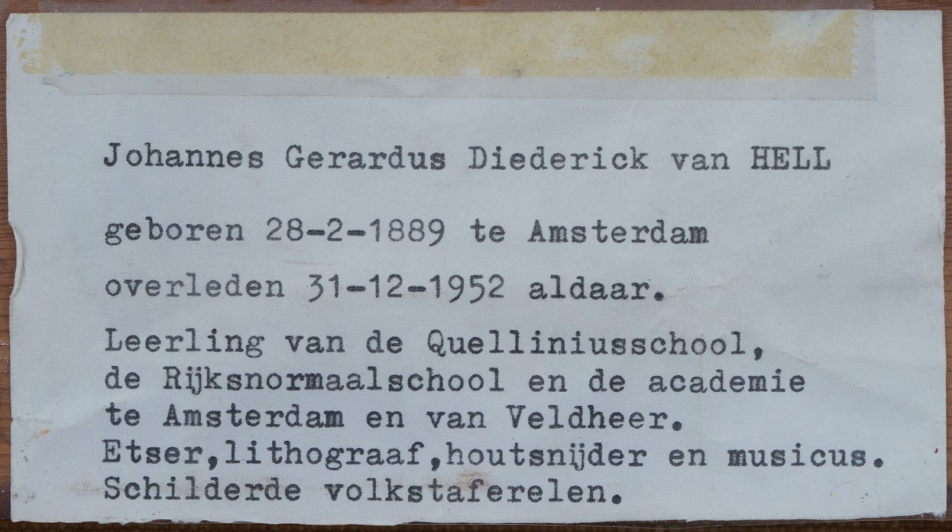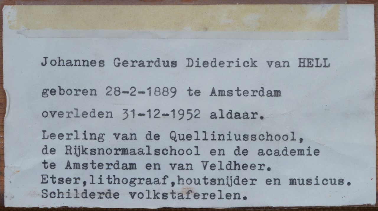 Literatuur: tent.cat. Amsterdam, Stedelijk Museum, 'Catalogus van schilderijen, beeldhouwwerken, teekeningen en grafische werken, tentoongesteld door de Vereeniging van Nederlandsche Beeldende Kunstenaren 'De Brug'', 1926, cat.nr. 83; Tineke Reijnders e.a., 'Johan van Hell 1889-1952', Warnsveld 2005, pag. 29, pag. 87, cat.nr. S 83 (met afb. in kleur); tent.cat. Kortenhoef, Oude School Kortenhoef, 'Man en paard in de moderne kunst', 2010, pag. 28.