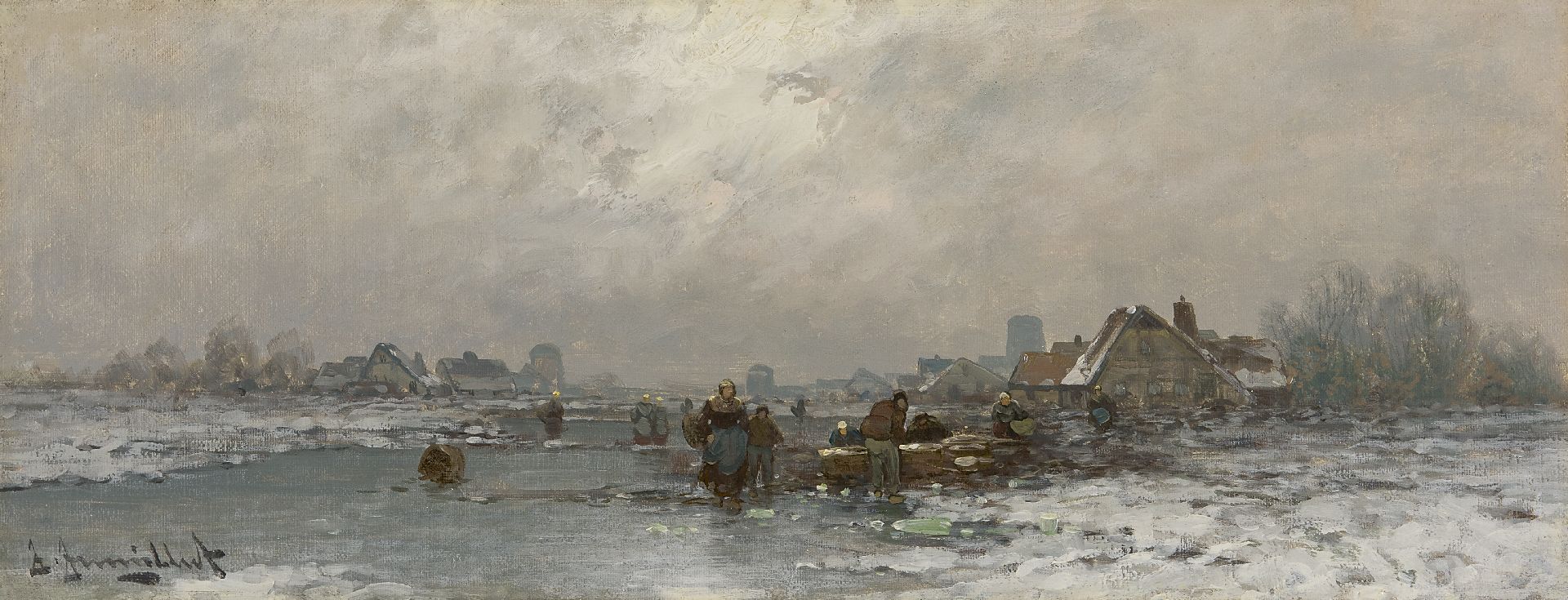 Johann Jungblut kunstwerk • schilderij • voorheen te koop Visverkoop op een bevroren rivier in Holland