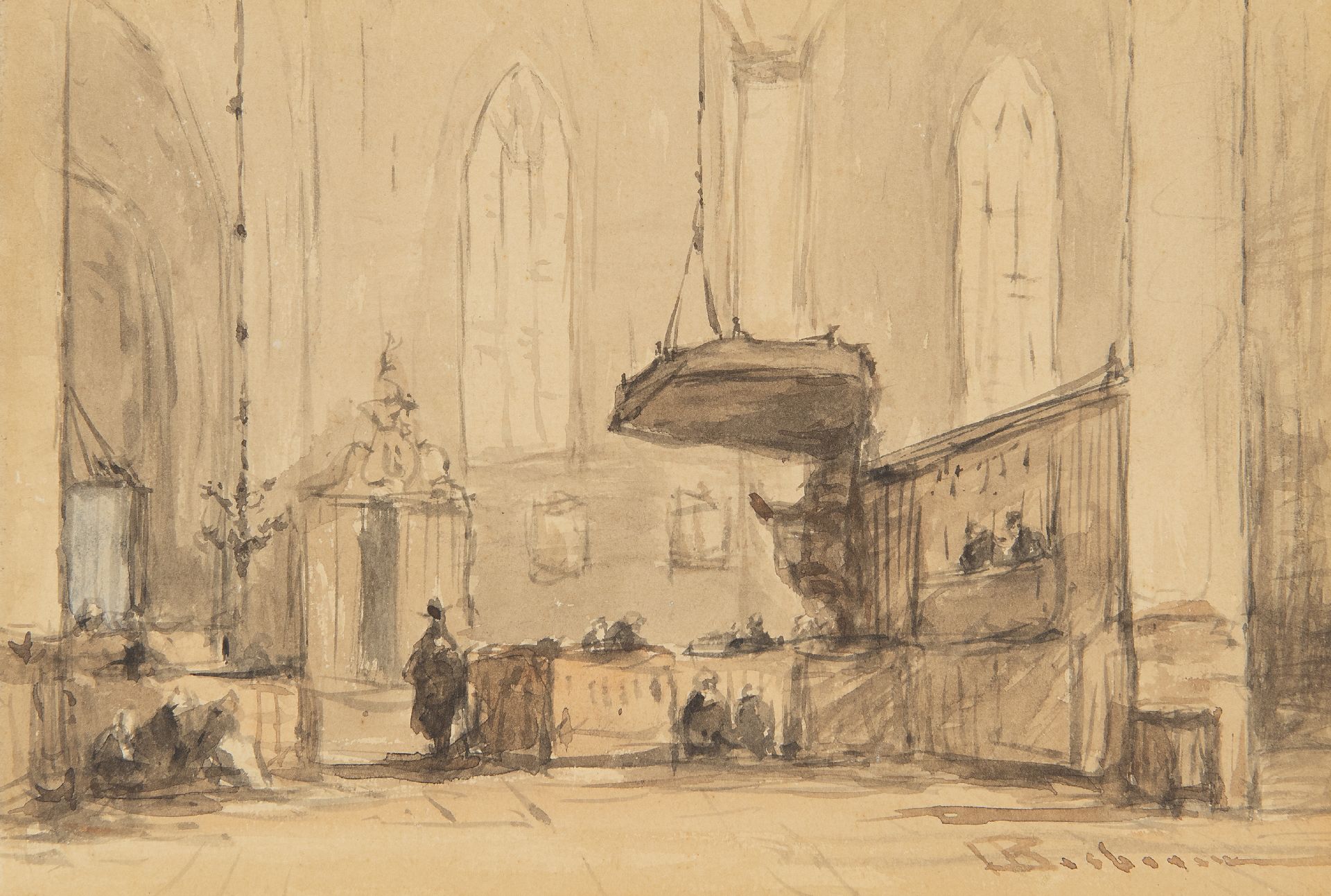Johannes Bosboom werd in 1817 geboren in Den Haag en ging in de leer bij de stadsgezichtenschilder Bart van Hove. Al spoedig koos hij het kerkinterieur als zijn specialiteit, daartoe aangemoedigd door de lof van zijn tijdgenoten. Zijn aquarellen en schilderijen tonen verstilde kerkinterieurs, bevolkt door figuren in 17e-eeuwse kledij. Als 'Haagse Scholer' probeerde hij de indrukken weer te geven die het gebouw op hem maakte. Daarnaast was hij geïnspireerd door de lichtval en atmosfeer in het werk van de 17e-eeuwse schilders Rembrandt en Emanuel de Witte.