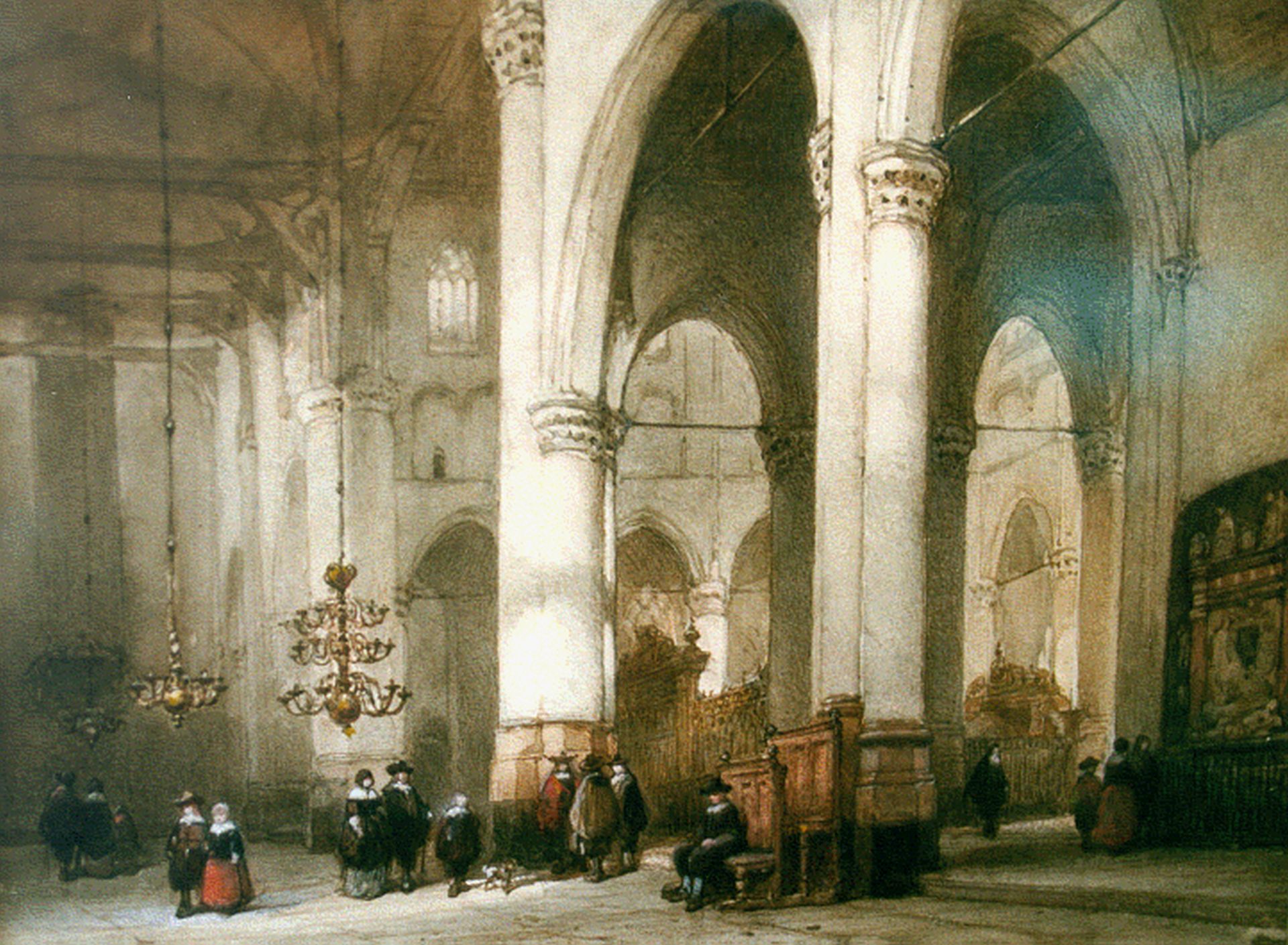 Johannes Bosboom werd in 1817 geboren in Den Haag en ging in de leer bij de stadsgezichtenschilder Bart van Hove. Al spoedig koos hij het kerkinterieur als zijn specialiteit, daartoe aangemoedigd door de lof van zijn tijdgenoten. Zijn aquarellen en schilderijen tonen verstilde kerkinterieurs, bevolkt door figuren in de 17de-eeuwse kledij. Als Haagse Scholer probeerde hij de indrukken weer te geven die het gebouw op hem maakte. Daarnaast was hij geïnspireerd door de lichtval en atmosfeer in het werk van de 17de-eeuwse schilders Rembrandt en Emanuel de Witte. Alle belangrijke musea bezitten werk van zijn hand.