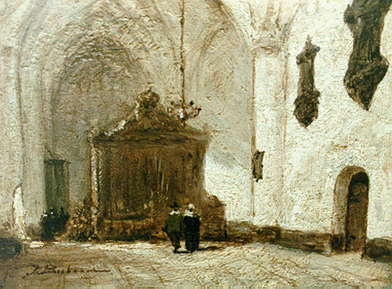 Johannes Bosboom werd in 1817 geboren in Den Haag en ging in de leer bij de stadsgezichtenschilder Bart van Hove. Al spoedig koos hij het kerkinterieur als zijn specialiteit, daartoe aangemoedigd door de lof van zijn tijdgenoten. Zijn aquarellen en schilderijen tonen verstilde kerkinterieurs, bevolkt door figuren in 17e-eeuwse kledij. Als 'Haagse Scholer' probeerde hij de indrukken weer te geven die het gebouw op hem maakte. Daarnaast was hij geïnspireerd door de lichtval en atmosfeer in het werk van de 17e-eeuwse schilders Rembrandt en Emanuel de Witte.