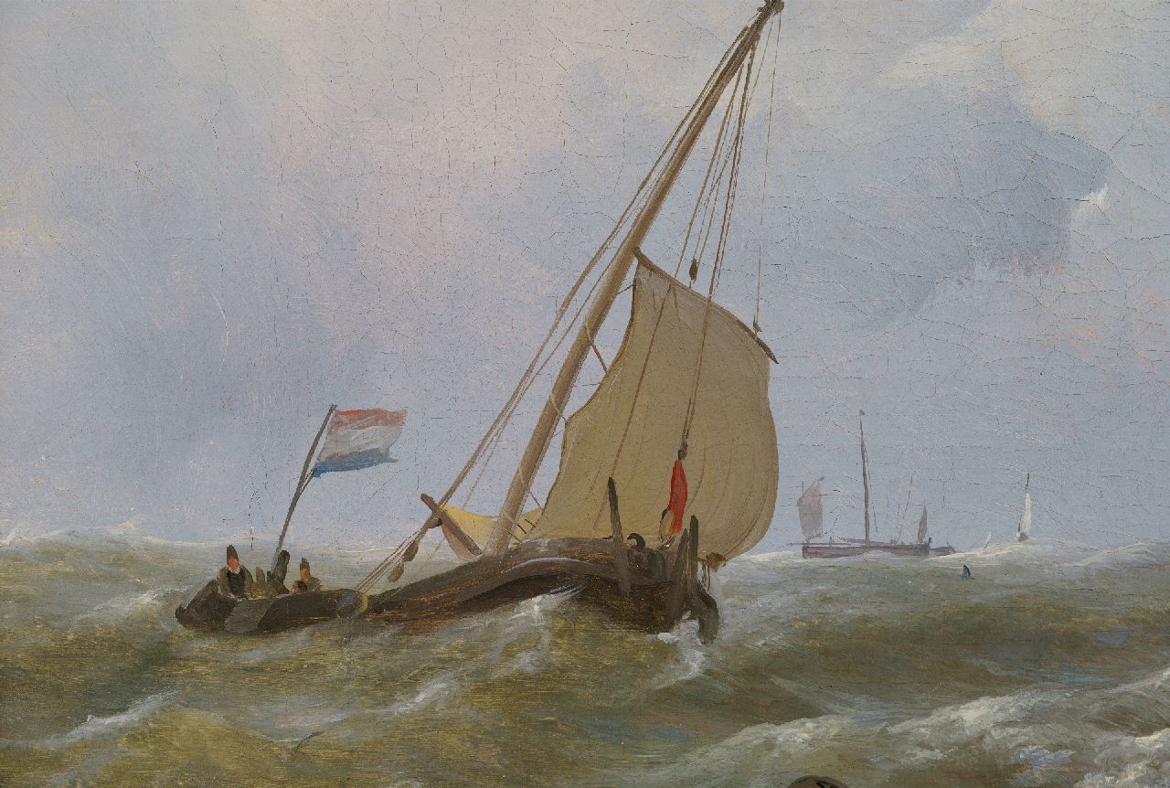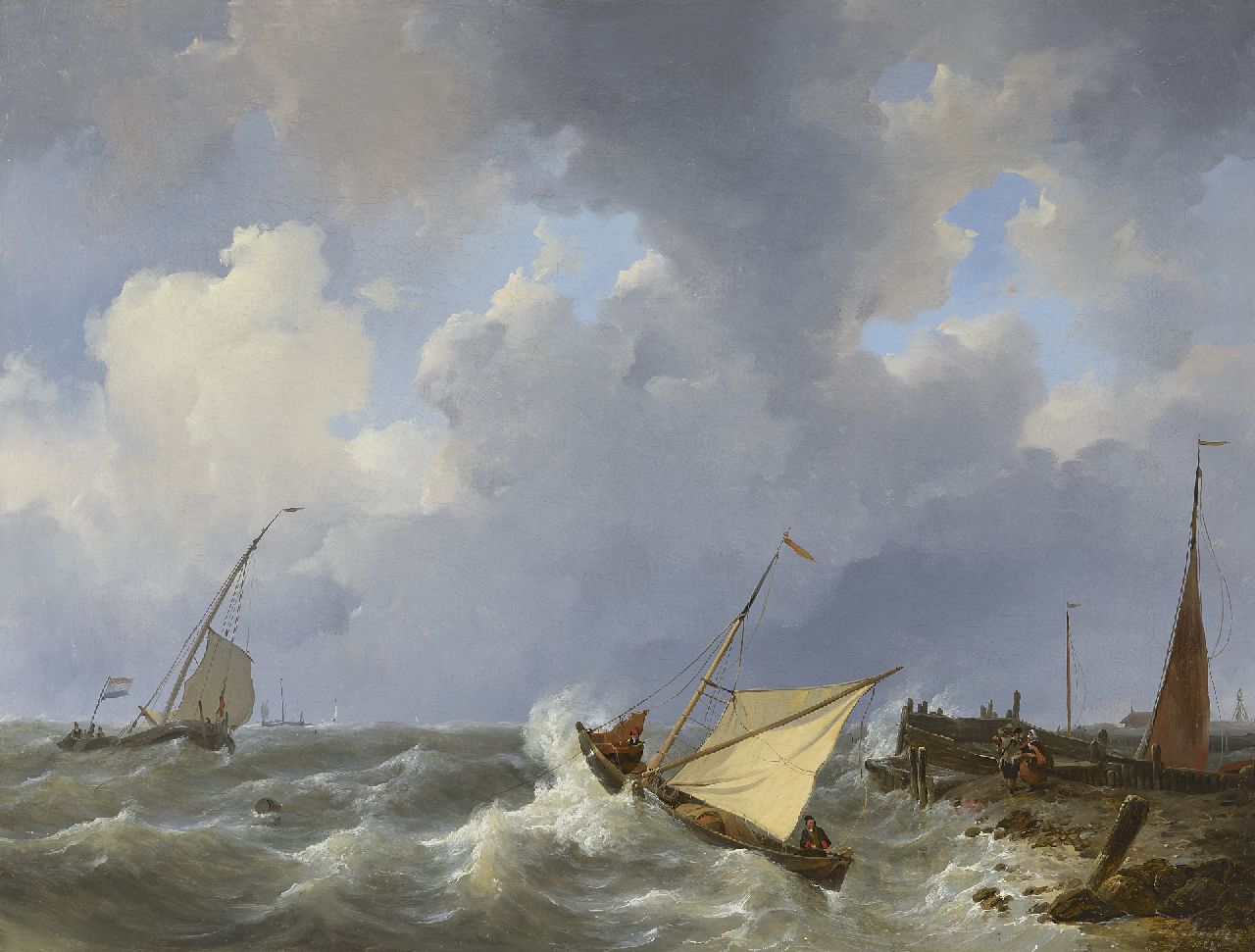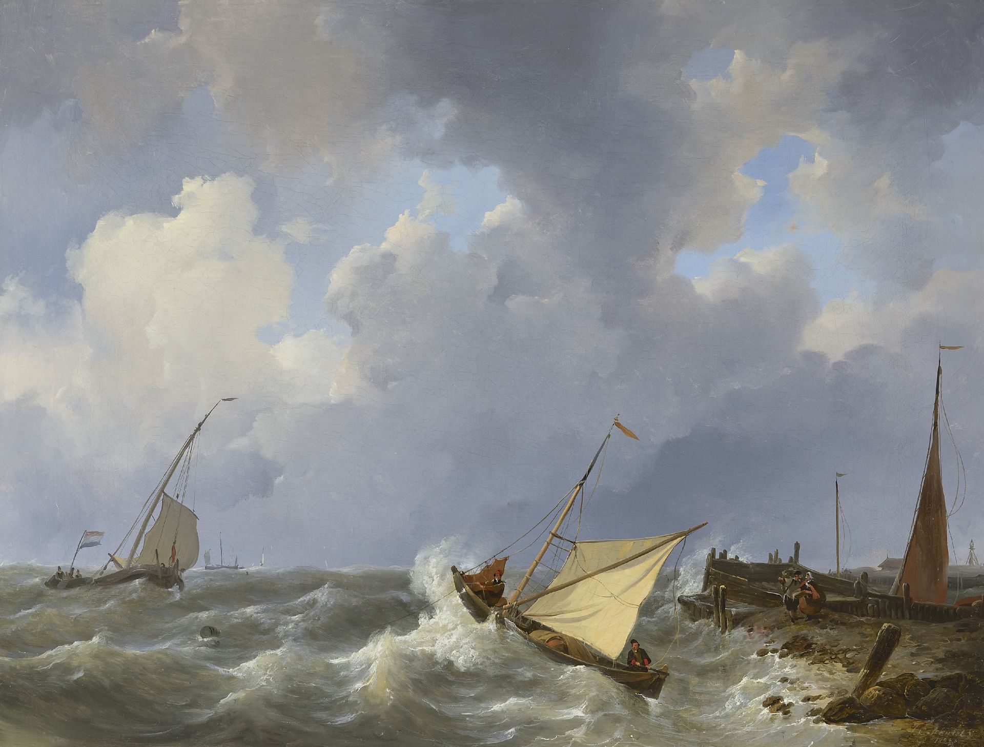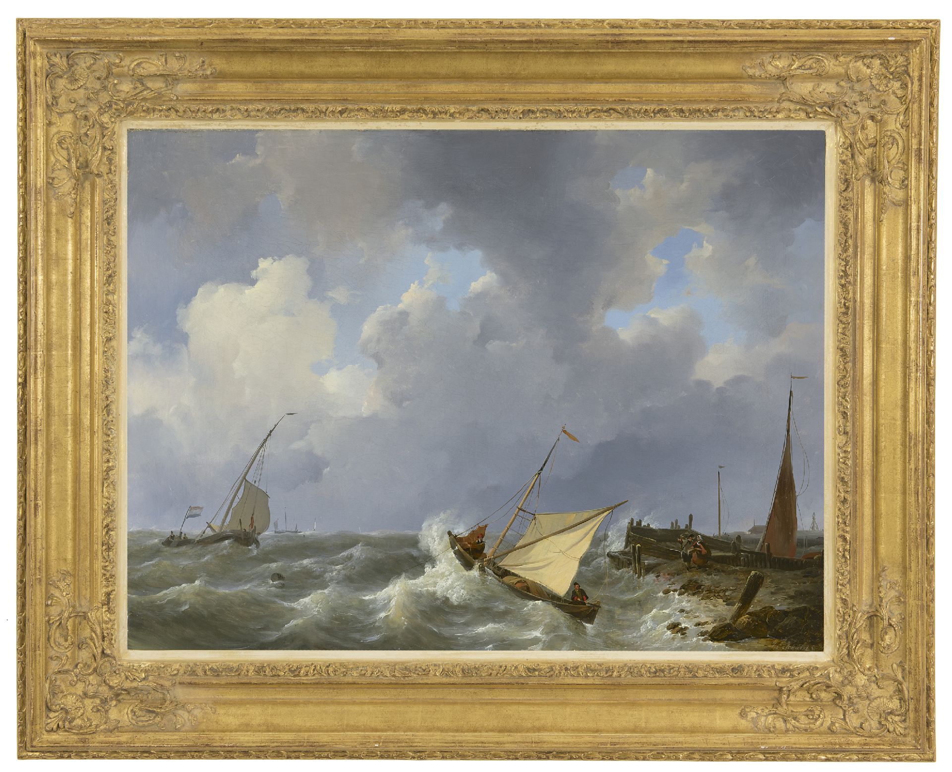 Johannes Christianus Schotel kunstwerk • schilderij • voorheen te koop Zeilschepen op ruwe zee bij een haveningang, een zeilschip voor anker in de branding