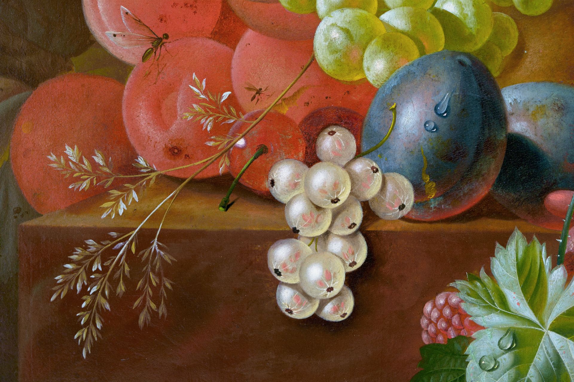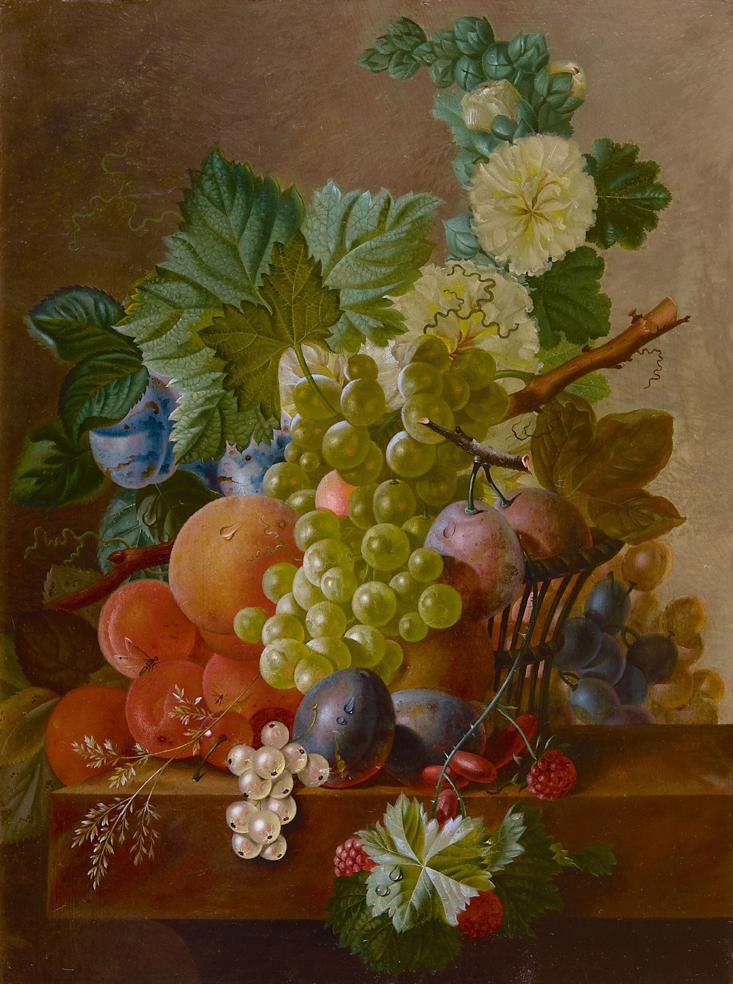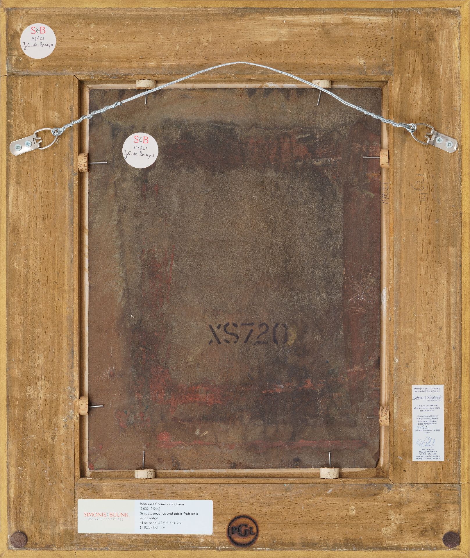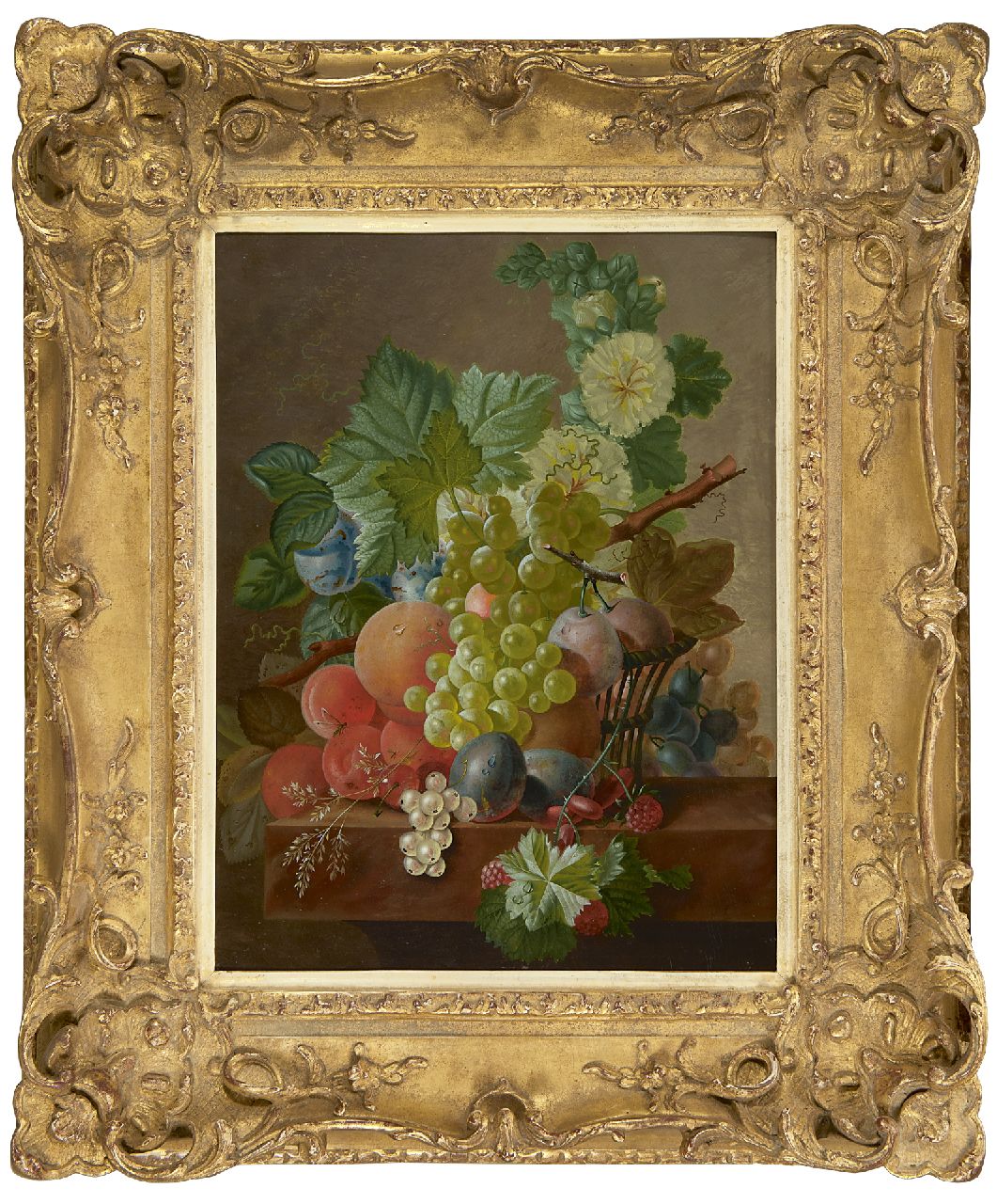 Johannes Cornelis de Bruyn kunstwerk • schilderij • te koop Druiven, perziken en ander fruit op een stenen plint