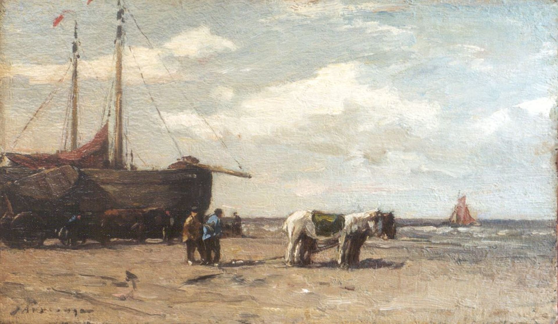 Johannes Evert Akkeringa kunstwerk • schilderij • voorheen te koop Bommen en schelpenkar op het strand