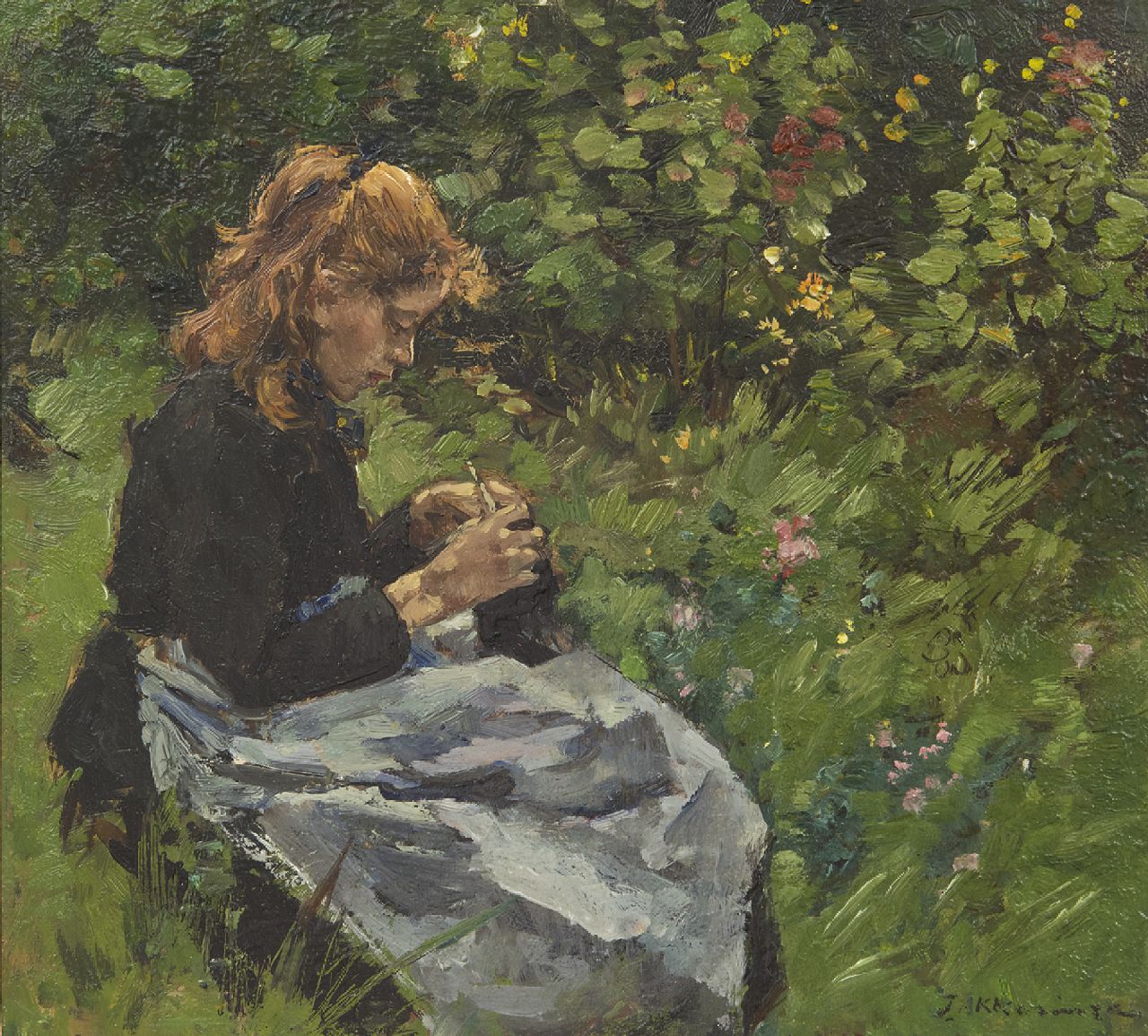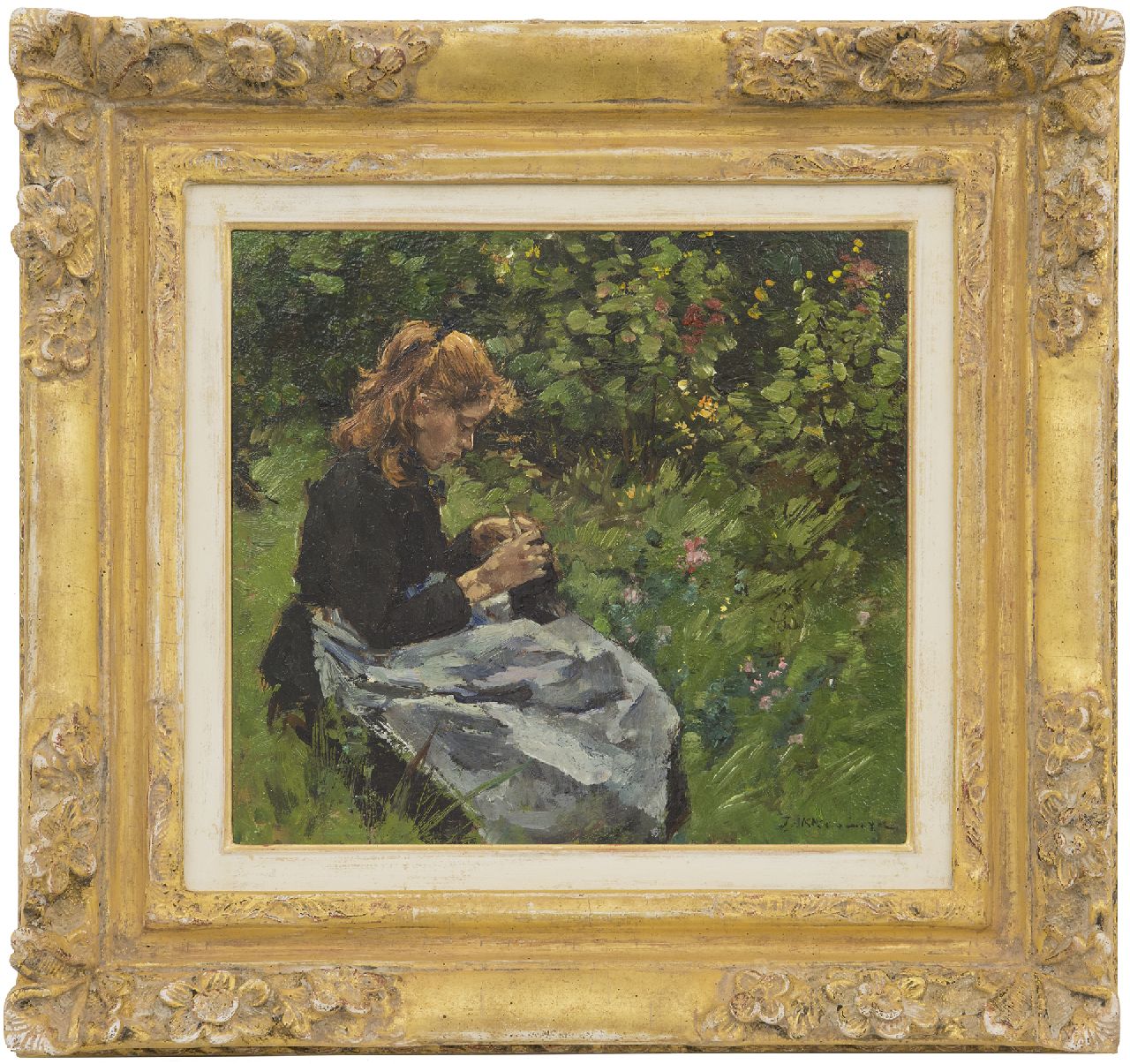 Johannes Evert Akkeringa kunstwerk • schilderij • voorheen te koop Breiend meisje in de tuin