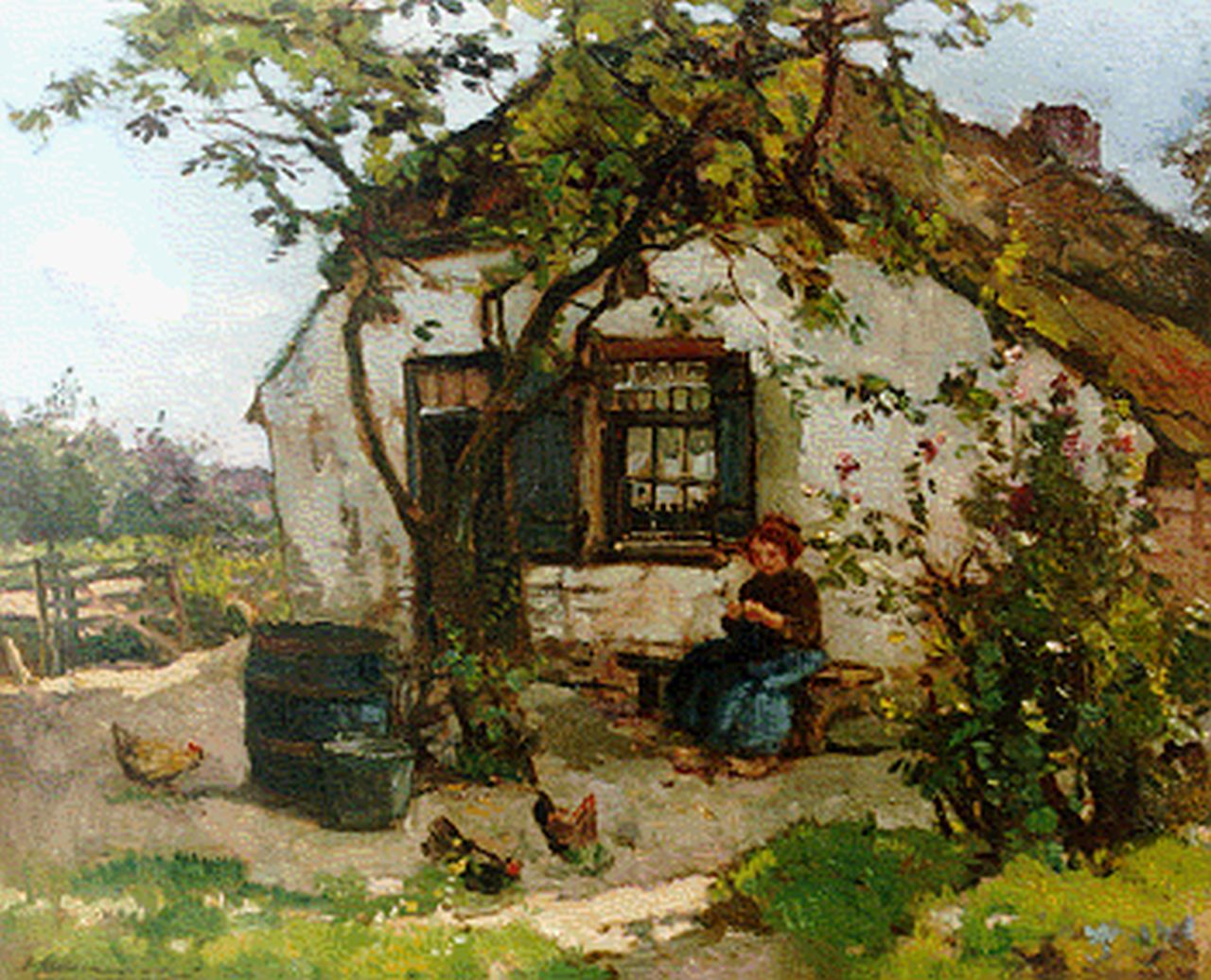 Johannes Evert Akkeringa kunstwerk • schilderij • voorheen te koop Breiende vrouw op boerenerf