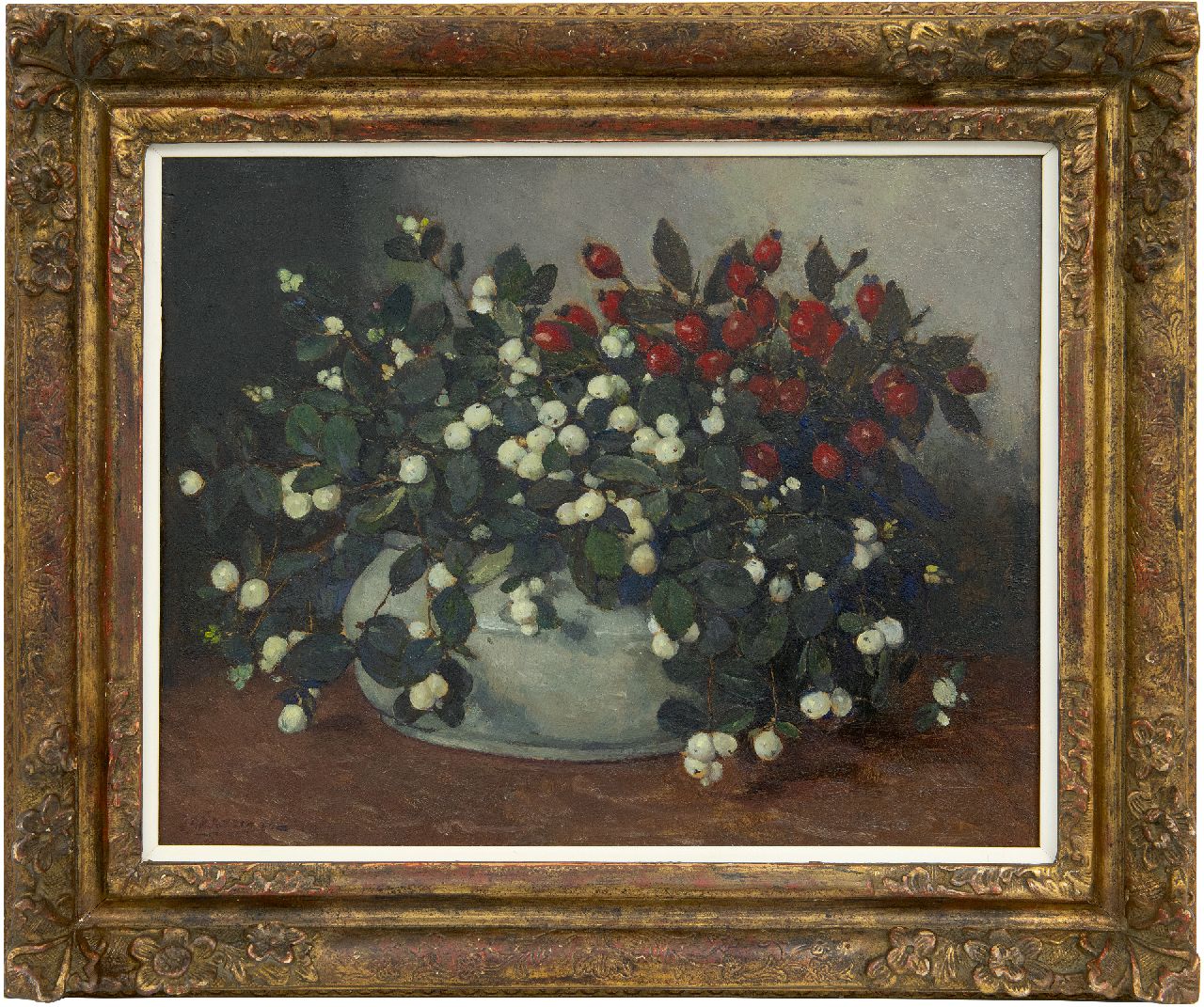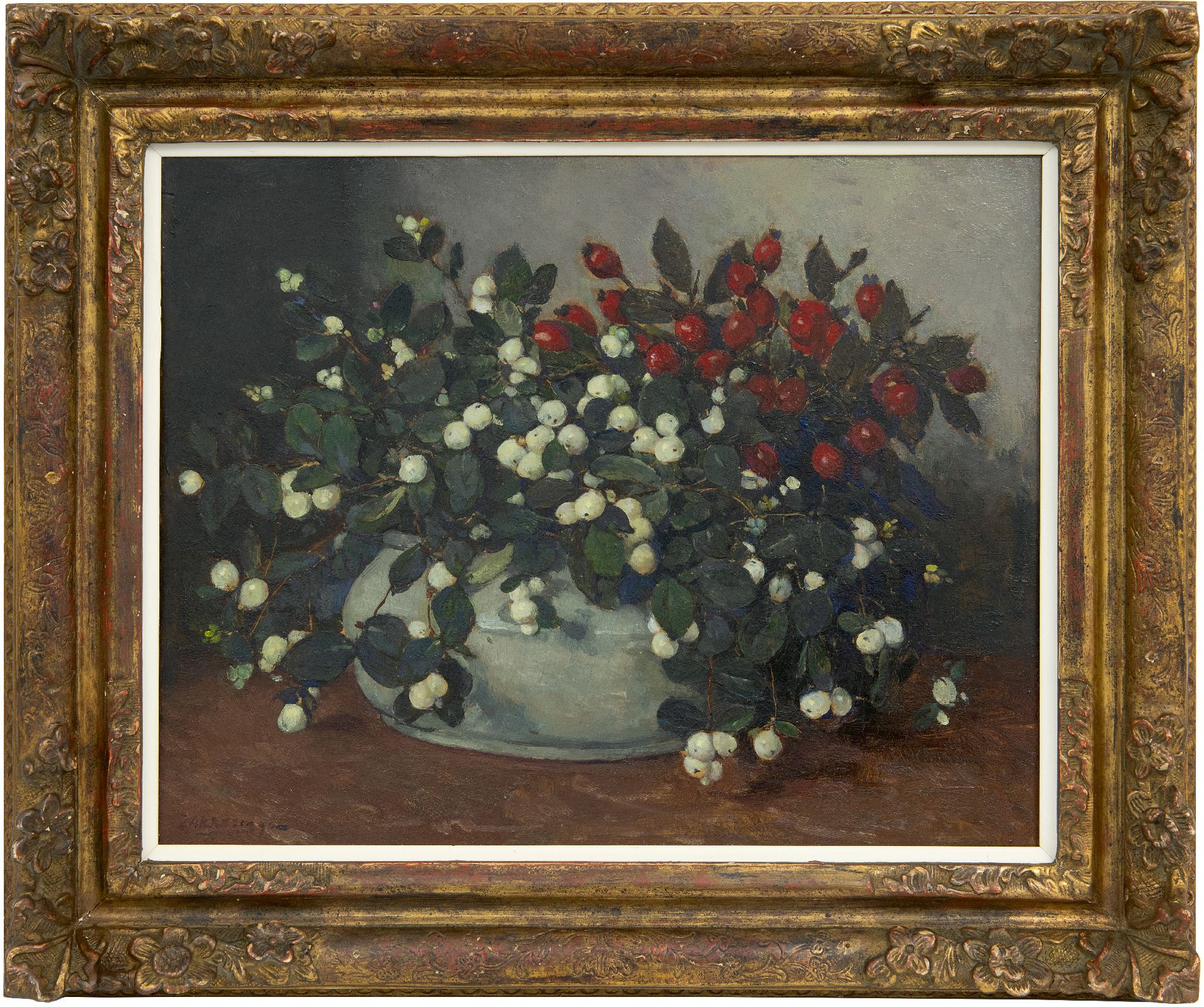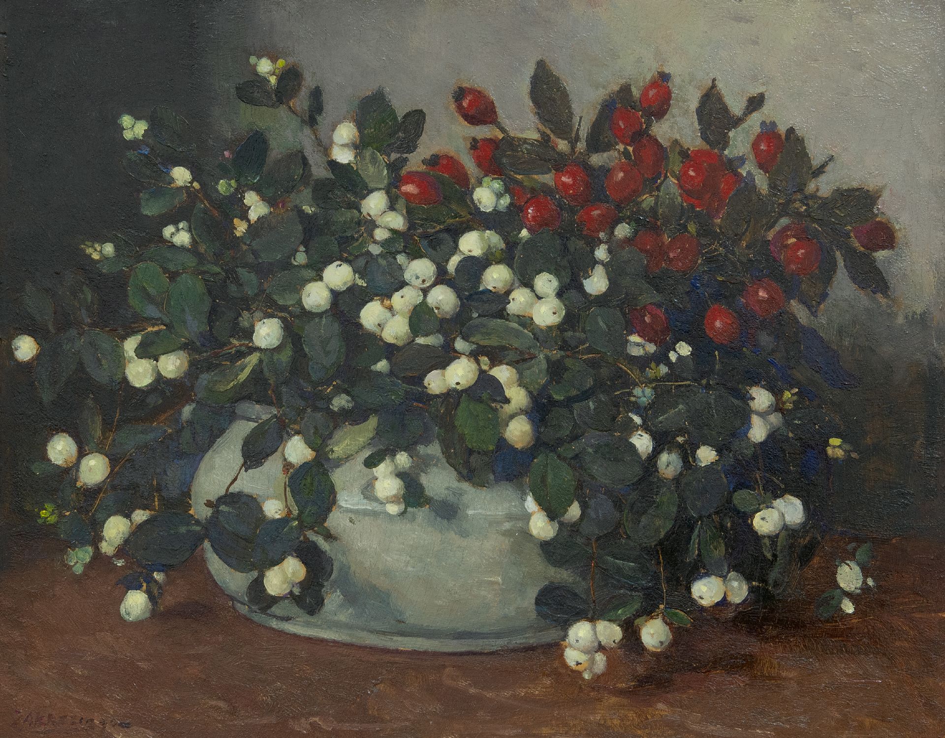 Johannes Evert Akkeringa kunstwerk • schilderij • voorheen te koop Sneeuwbessen en rozenbottels in witte vaas