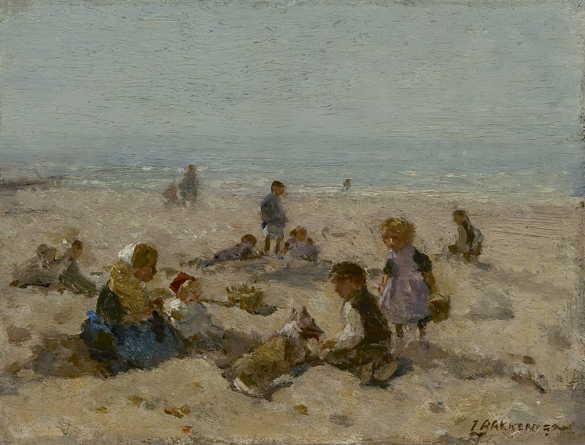 Johannes Evert Akkeringa kunstwerk • schilderij • voorheen te koop Spelende kinderen op het strand van Scheveningen