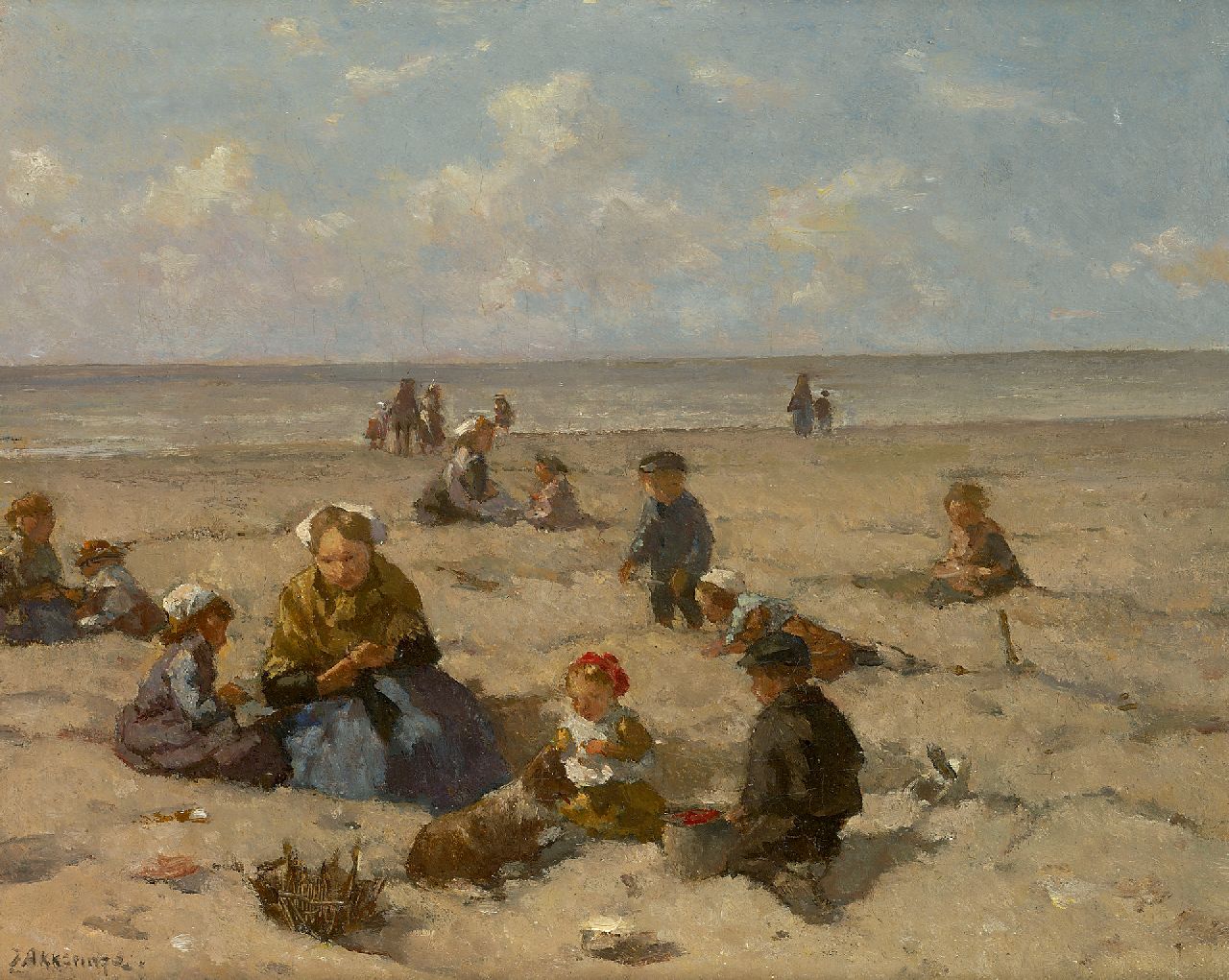 Johannes Evert Akkeringa schilderde prachtige stillevens met bloemen, maar is vooral bekend geworden door zijn zonnige duin- en strandgezichten bevolkt door vissersvrouwen en kinderen. Het zijn vaak blijmoedige Hollandse tafereeltjes, de vrouwen vredig werkend, de kinderen spelend in het zand onder een blauwe lucht met hoge bewolking. Ook schilderde hij deftige Haagse kinderen spelend in de duinen of op het strand. Akkeringa wordt tot de late Haagse School gerekend.
