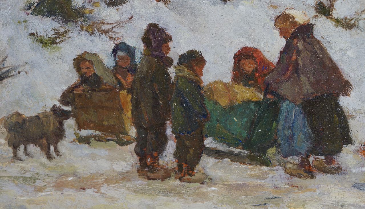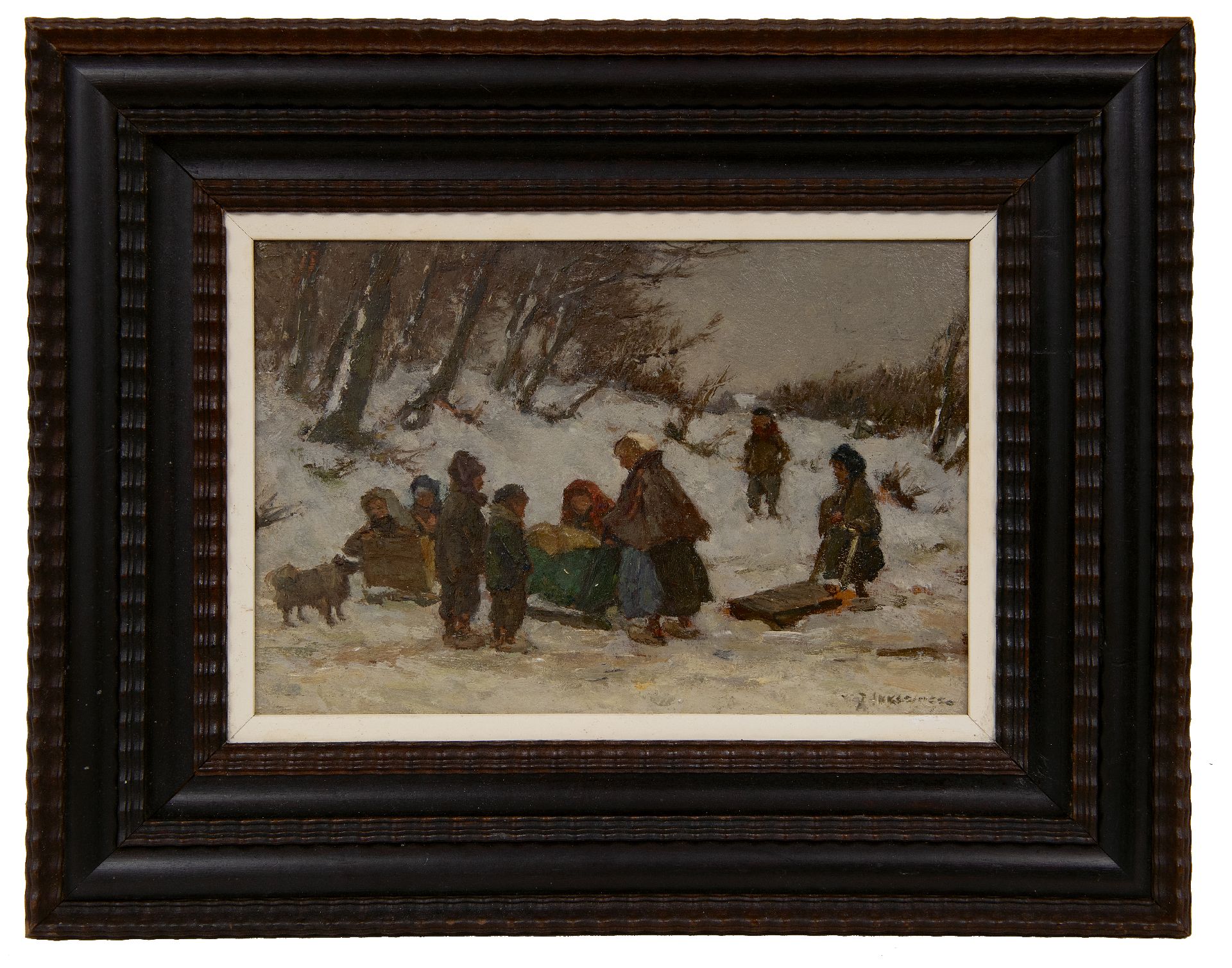 De Haagse schilder Johannes Evert Akkeringa werd vooral bekend om zonnige duin- en strandgezichten, bevolkt door vrouwen en kinderen. Het zijn vrijwel altijd zomerse, blijmoedige voorstellingen, de vrouwen vredig werkend, de kinderen spelend onder een blauwe lucht. Met de Hollandse winters had de in het tropische Indonesië geboren Akkeringa vermoedelijk niet zoveel op. Het was dan koud, en als de natuur bedekt was met een laag sneeuw werden de wegen en paden onbegaanbaar en was alles op wielen onbruikbaar. Dan kwamen de sledes tevoorschijn. Een schilder met een goed oog, zoals hij, zag daarin toch wel iets moois. In dit winterse tafereeltje schildert hij een groepje spelende kinderen bij een vrouw met een duwslee. Daarin ligt vermoedelijk een warm ingepakt kindje, waar ze nieuwsgierig en verwonderd naar kijken.