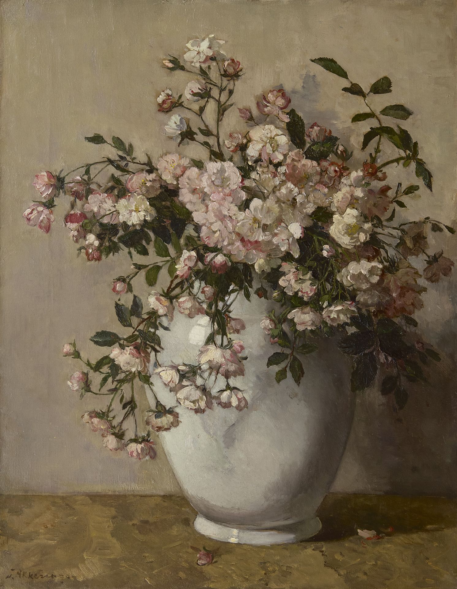 Johannes Evert Akkeringa kunstwerk • schilderij • voorheen te koop Witte pot met trosroosjes