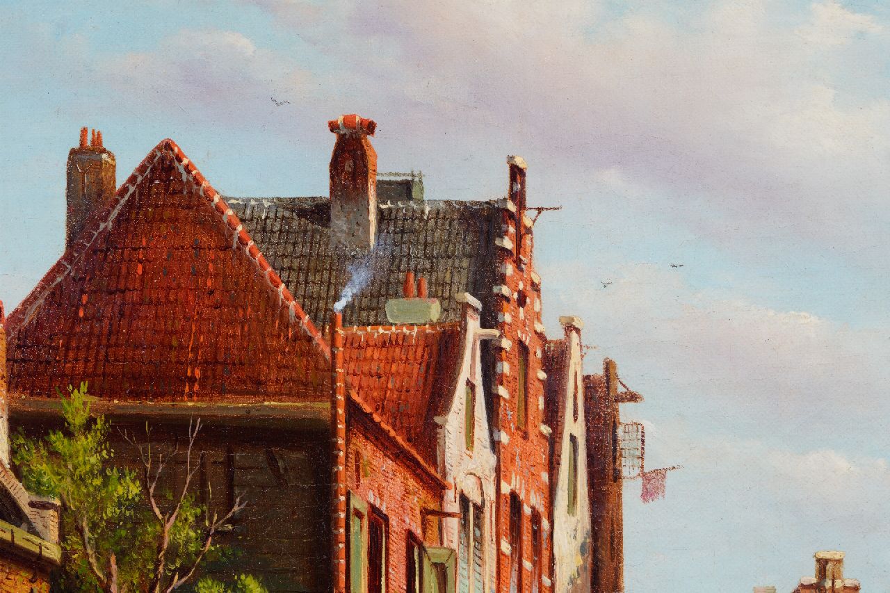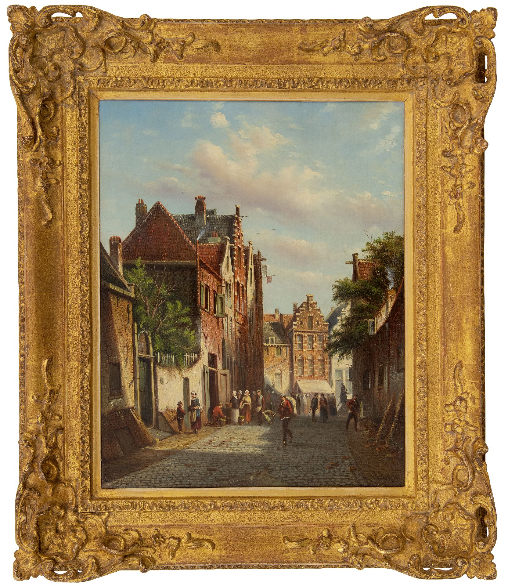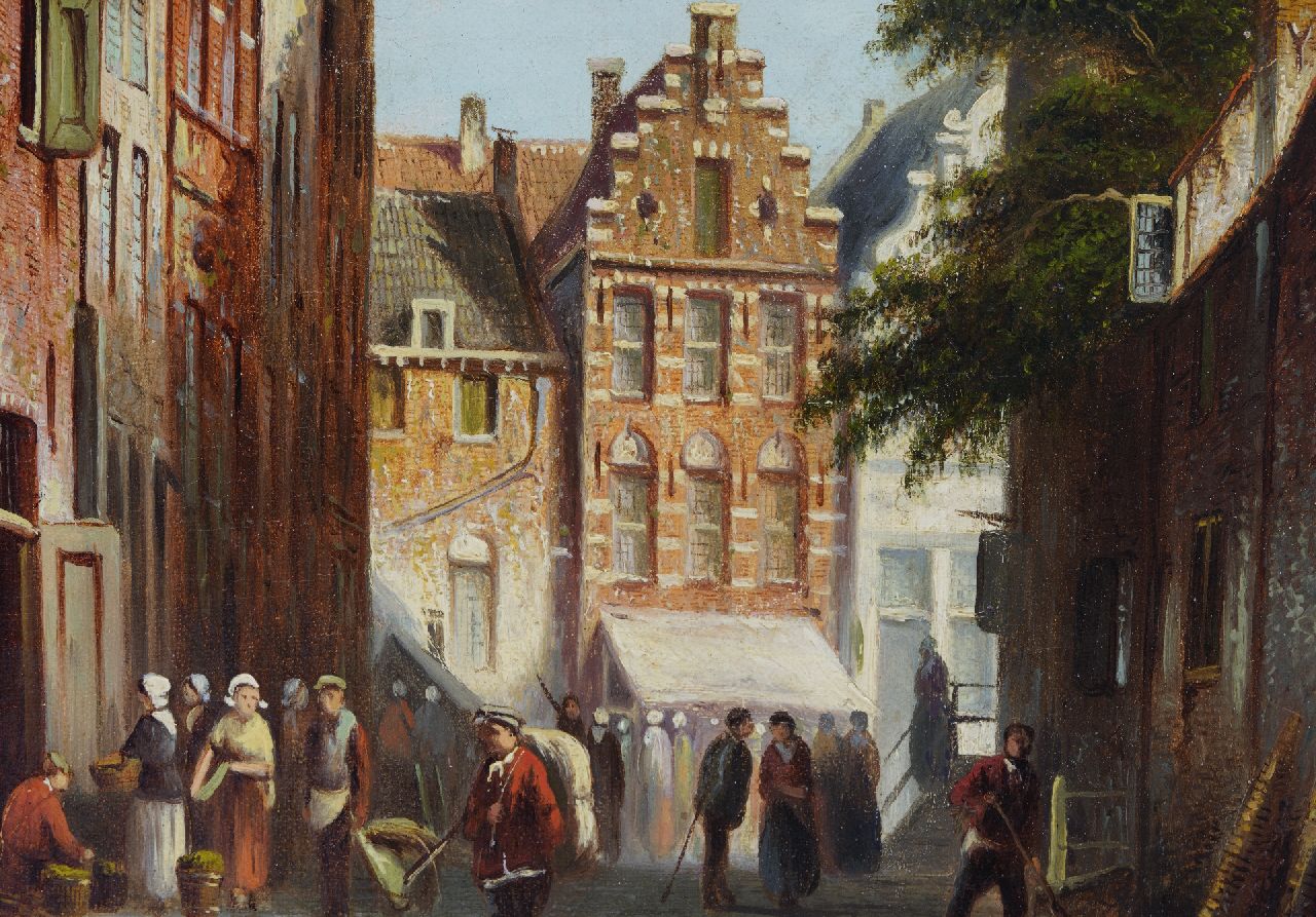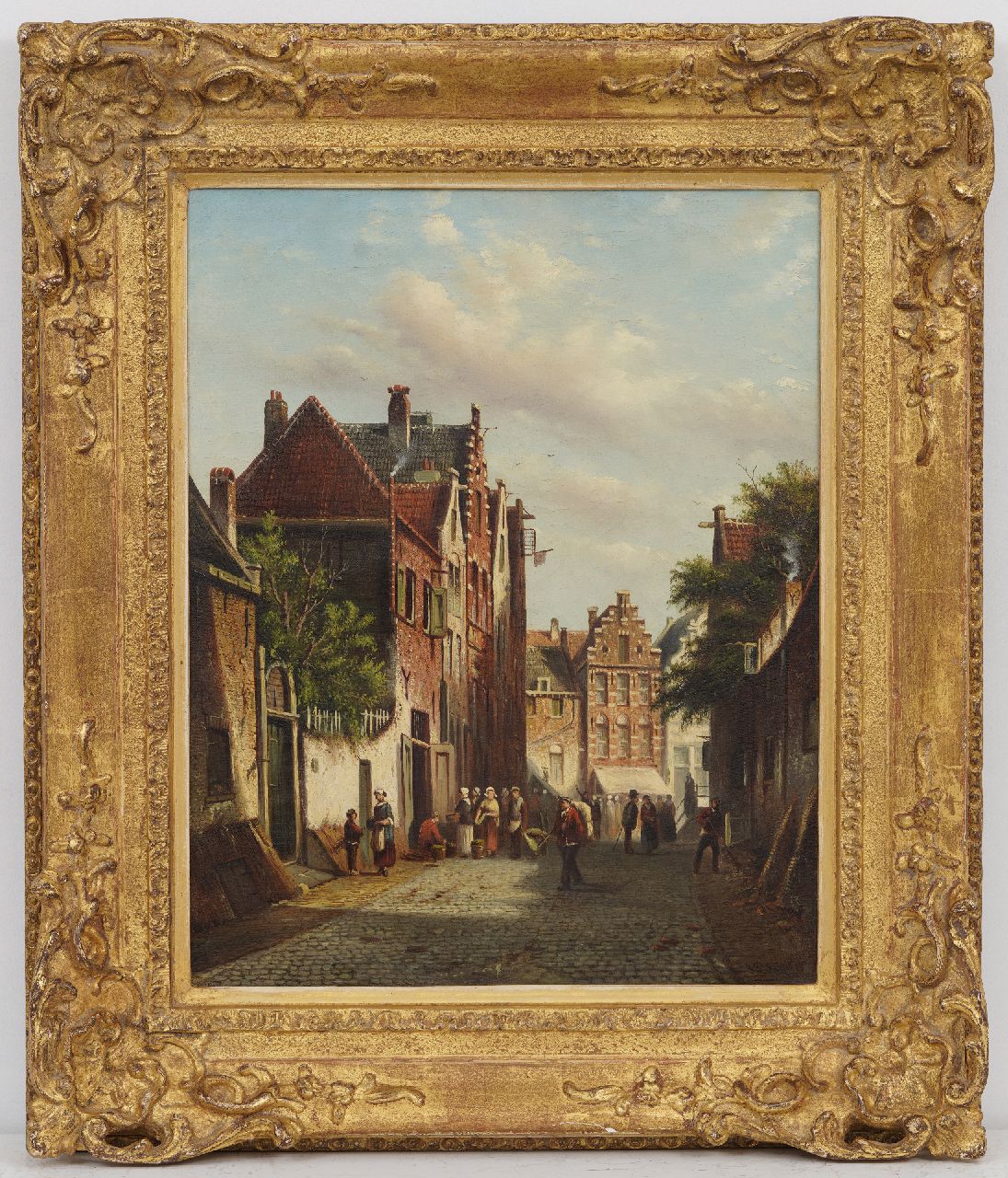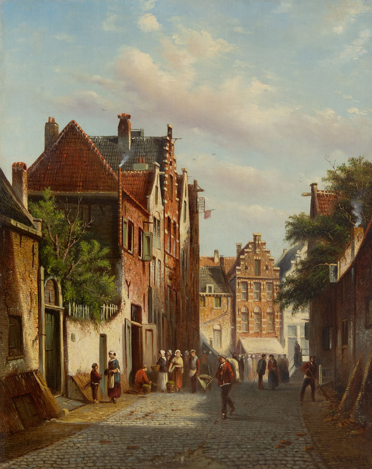 Johannes Franciscus Spohler kunstwerk • schilderij • te koop Bedrijvigheid in een zonovergoten straat