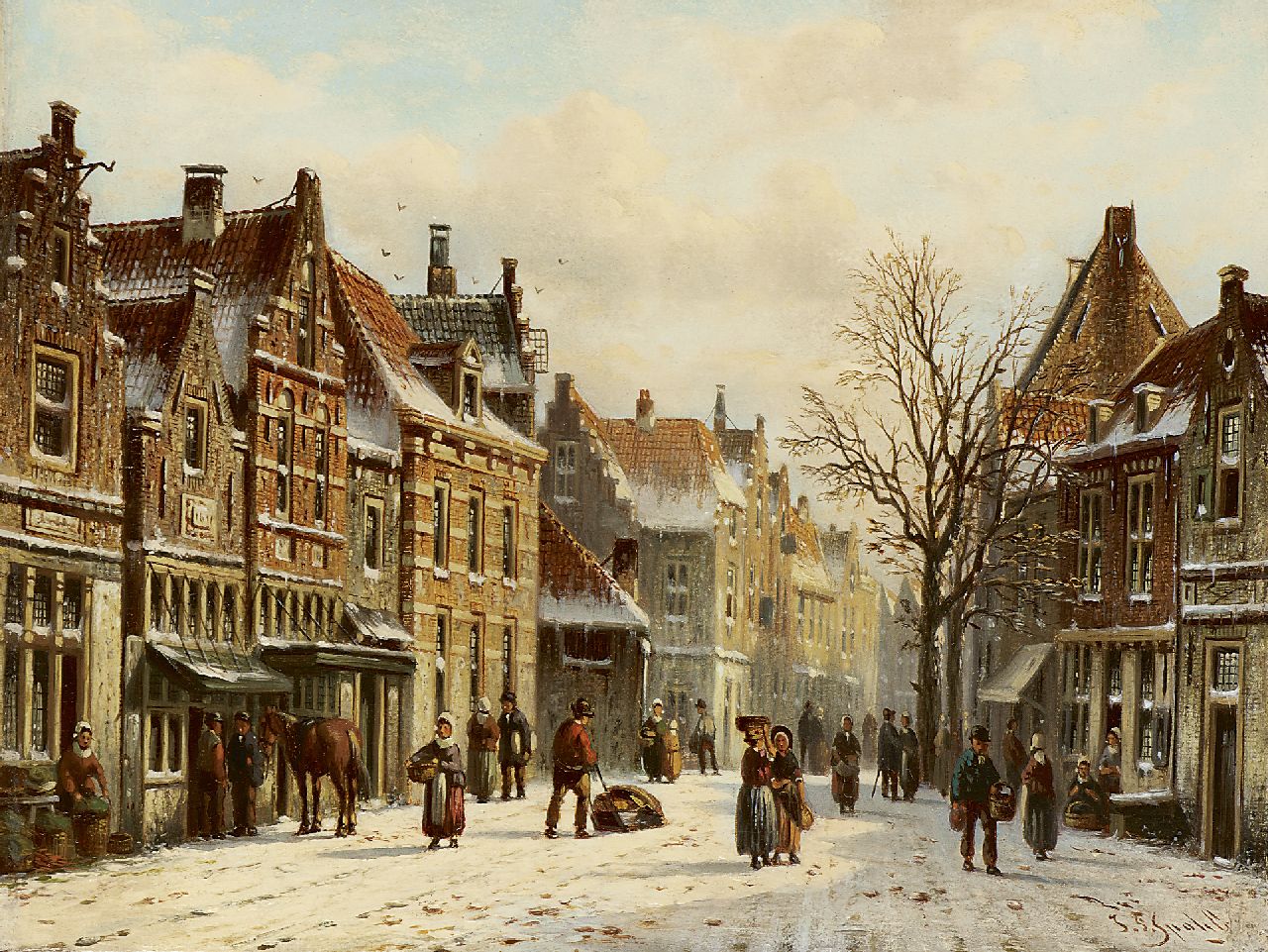 Johannes Franciscus Spohler kunstwerk • schilderij • voorheen te koop Besneeuwde straat met figuren (pendant van 12077)