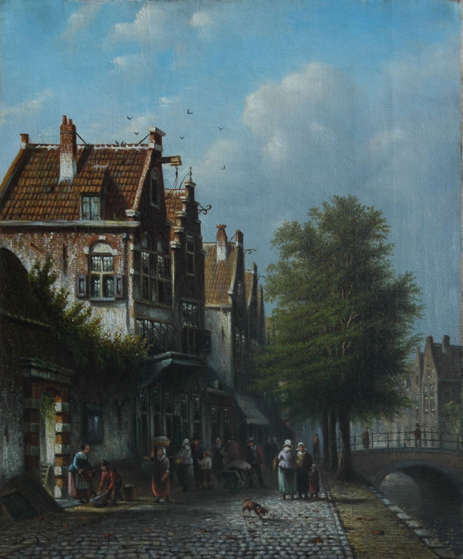 Johannes Franciscus Spohler kunstwerk • schilderij • voorheen te koop Dagelijkse drukte in een Oudhollands stadje