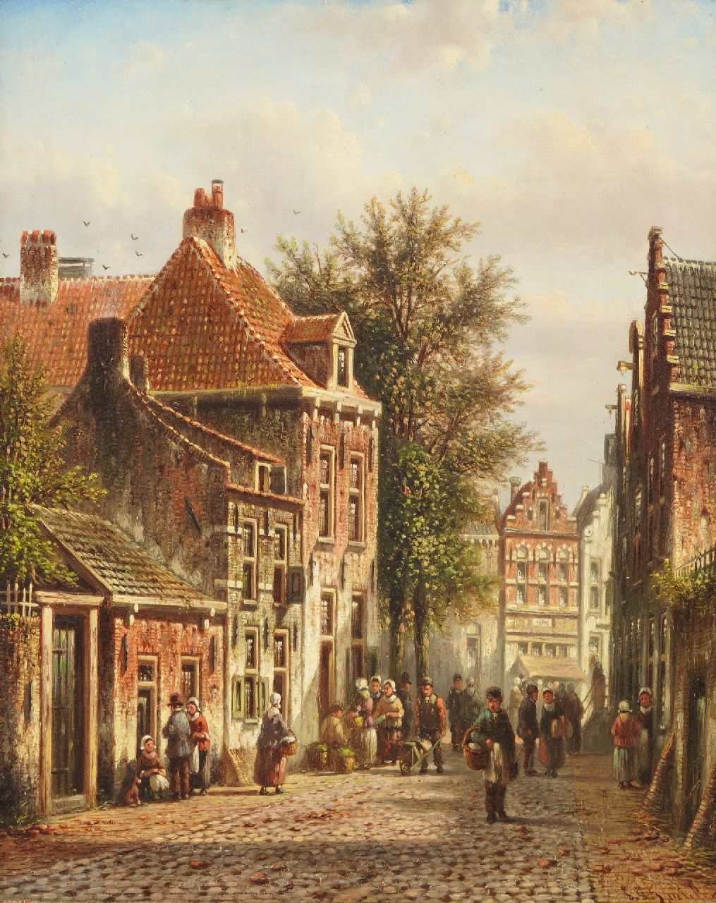 Johannes Franciscus Spohler kunstwerk • schilderij • te koop Drukbevolkt Hollands straatje