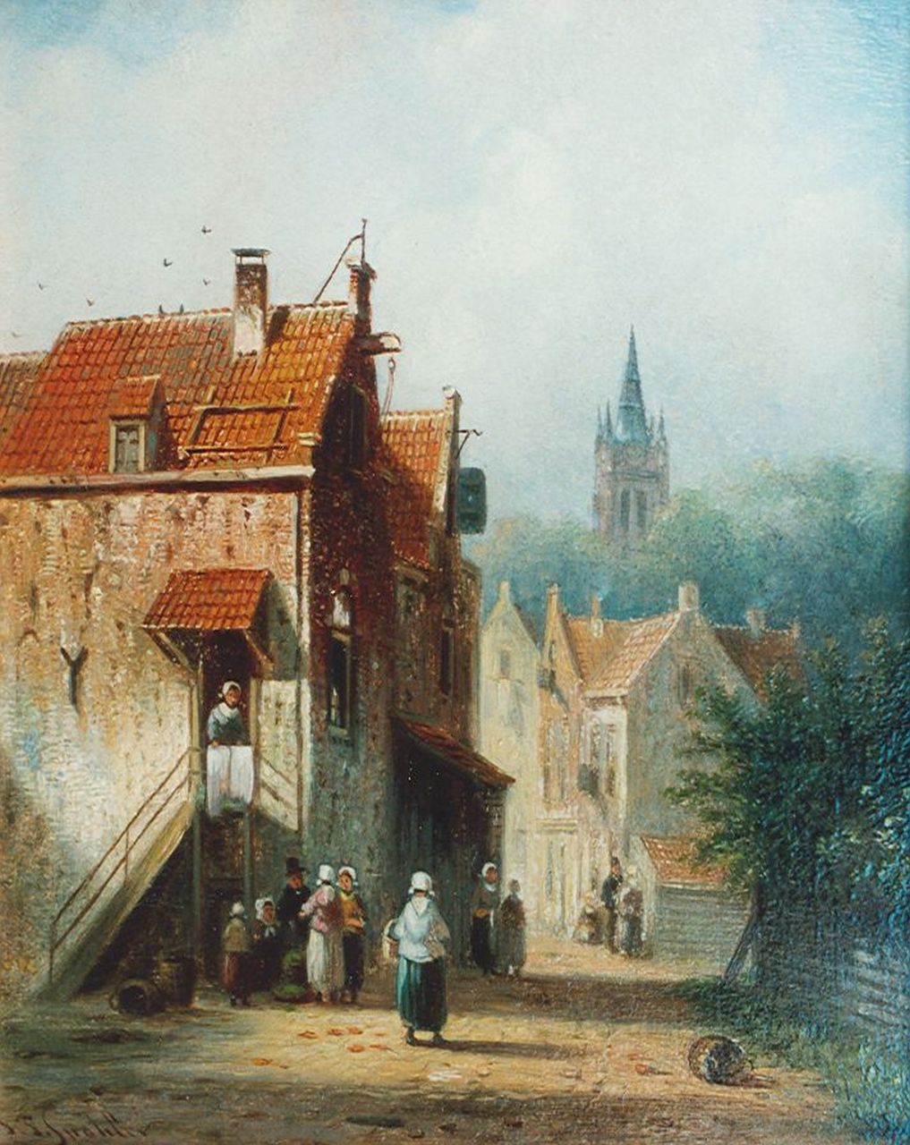 Johannes Franciscus Spohler kunstwerk • schilderij • voorheen te koop Figuren in een straatje