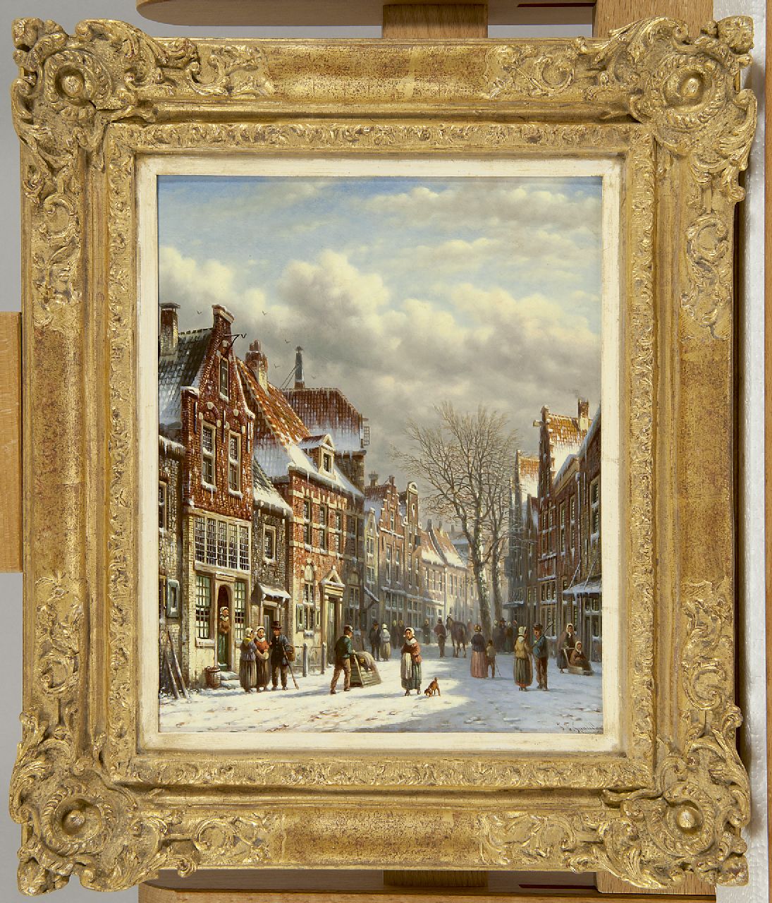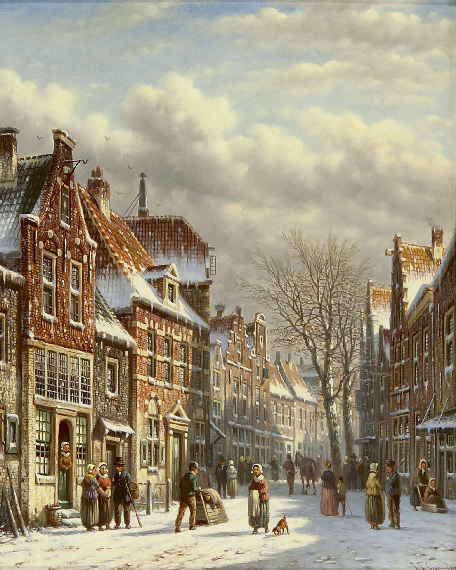 Johannes Franciscus Spohler kunstwerk • schilderij • voorheen te koop Figuren op een besneeuwd stadsplein (pendant van 15516)