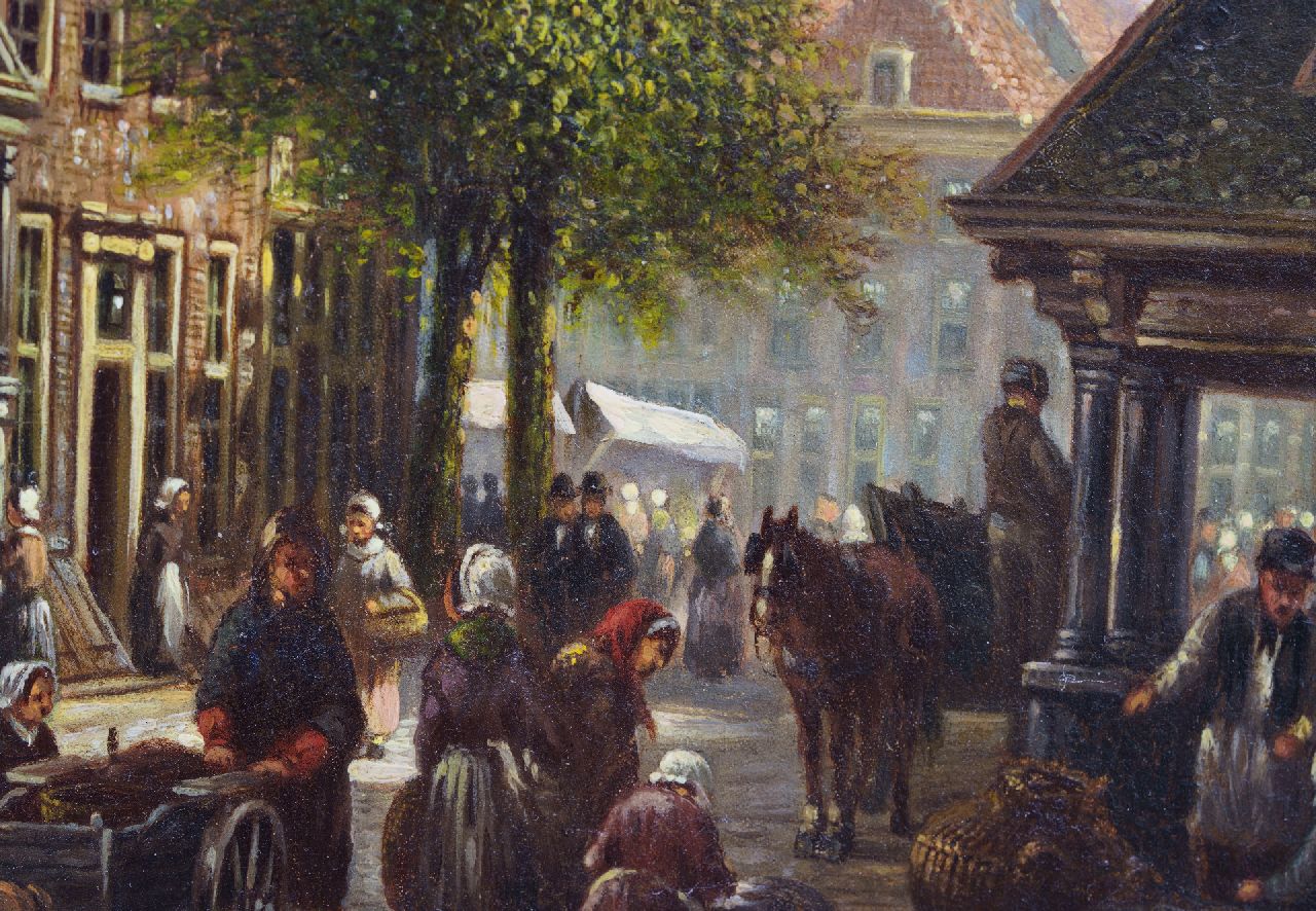 Johannes Franciscus Spohler was een buitenbeentje in zijn schilderende familie. Als enige koos hij het Hollandse stadsgezicht als specialisatie, terwijl zijn vader en broer winterlandschappen en zomerse riviergezichten schilderden. Zijn grote voorbeeld was het werk van de Amsterdammer Cornelis Springer: zonnige straatjes met Oudhollandse huizen, druk bevolkt met figuren van allerlei pluimage. Mede door Springers populariteit was er in de 19e eeuw een goede markt ontstaan voor stadsgezichten met Hollandse historische gebouwen, zowel in eigen land als daarbuiten. Voor bovenstaand schilderij nam Spohler het 16e-eeuwse stadhuis van Den Haag als onderwerp. Een schitterend en rijk gedecoreerd gebouw in Hollandse Renaissancestijl met een toren van lagen baksteen en zandsteen. Hij koos - mogelijk in opdracht - voor de oorspronkelijke staat. Het afdakje boven de ingang en de torenaanbouw op de begane grond verdwenen namelijk omstreeks 1865 en 1880. Rond 1912, Spohler leefde toen niet meer, werd het gebouw te klein voor zijn functie. Het Oude Stadhuis staat er nog steeds, ingeklemd tussen andere gebouwen en niet meer zo glorieus als op dit schilderij.
