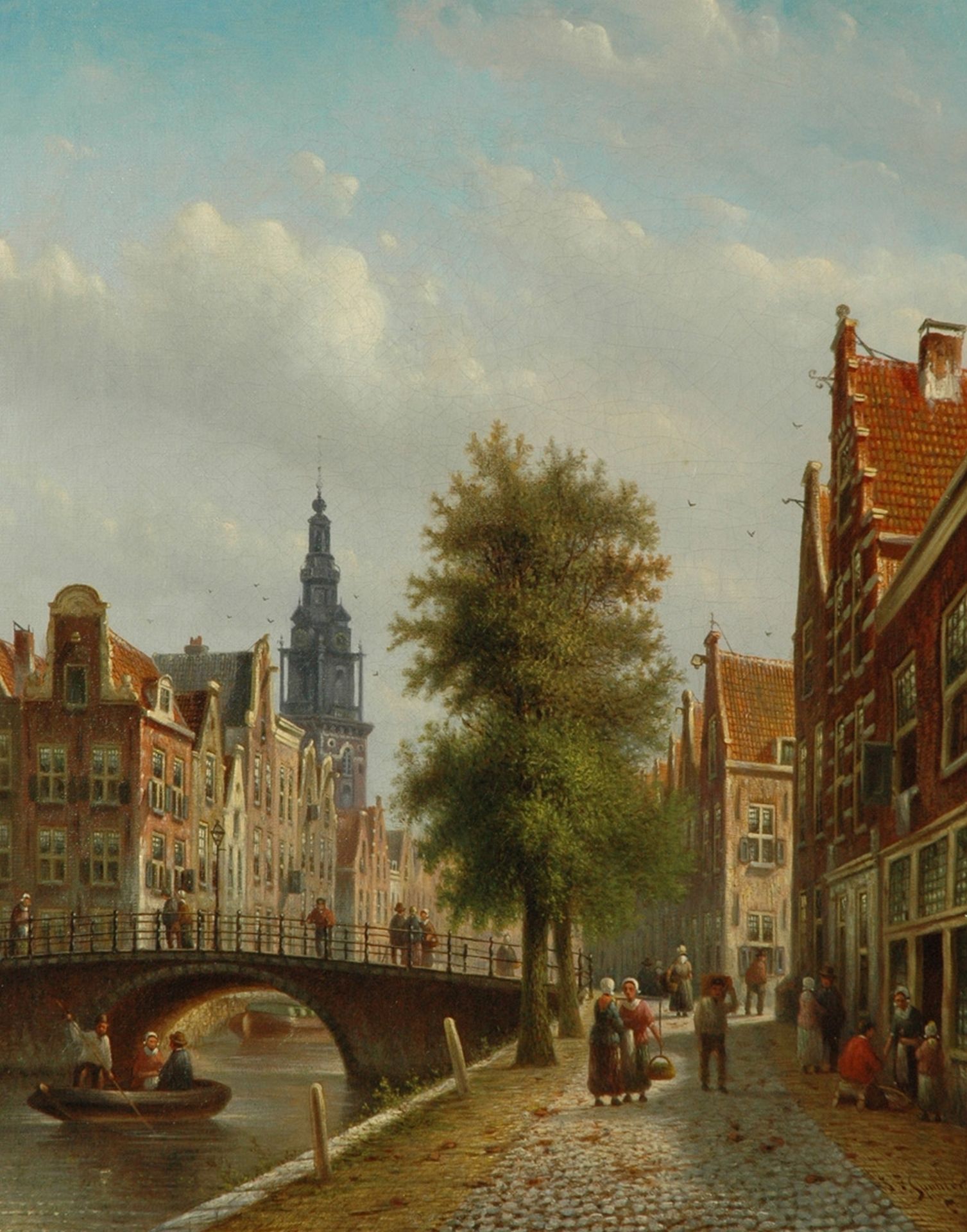 Johannes Franciscus Spohler kunstwerk • schilderij • voorheen te koop Hollands stadsgezicht met de Amsterdamse Zuiderkerk